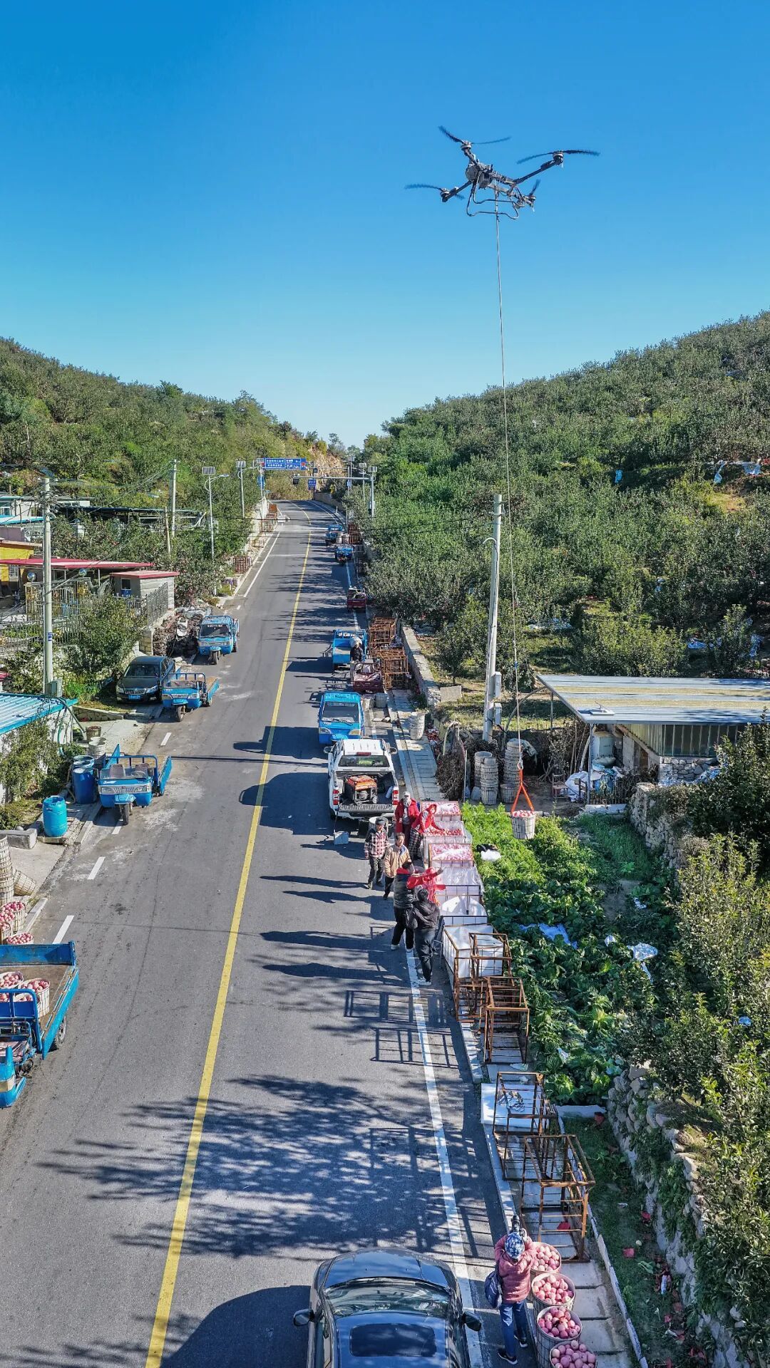 今年,东马屯村引入无人机运输苹果,解锁了苹果运输新场景。无人机化身在果园上方来回穿梭,稳稳地将苹果依次从山间送达马路边,开辟了一条新的“空中通道”,打破了以往依赖人工运输的局限,运输效率大大提升。据了解,无人机单次能运载数十至上百斤苹果,大大减轻了果农的劳动负担。