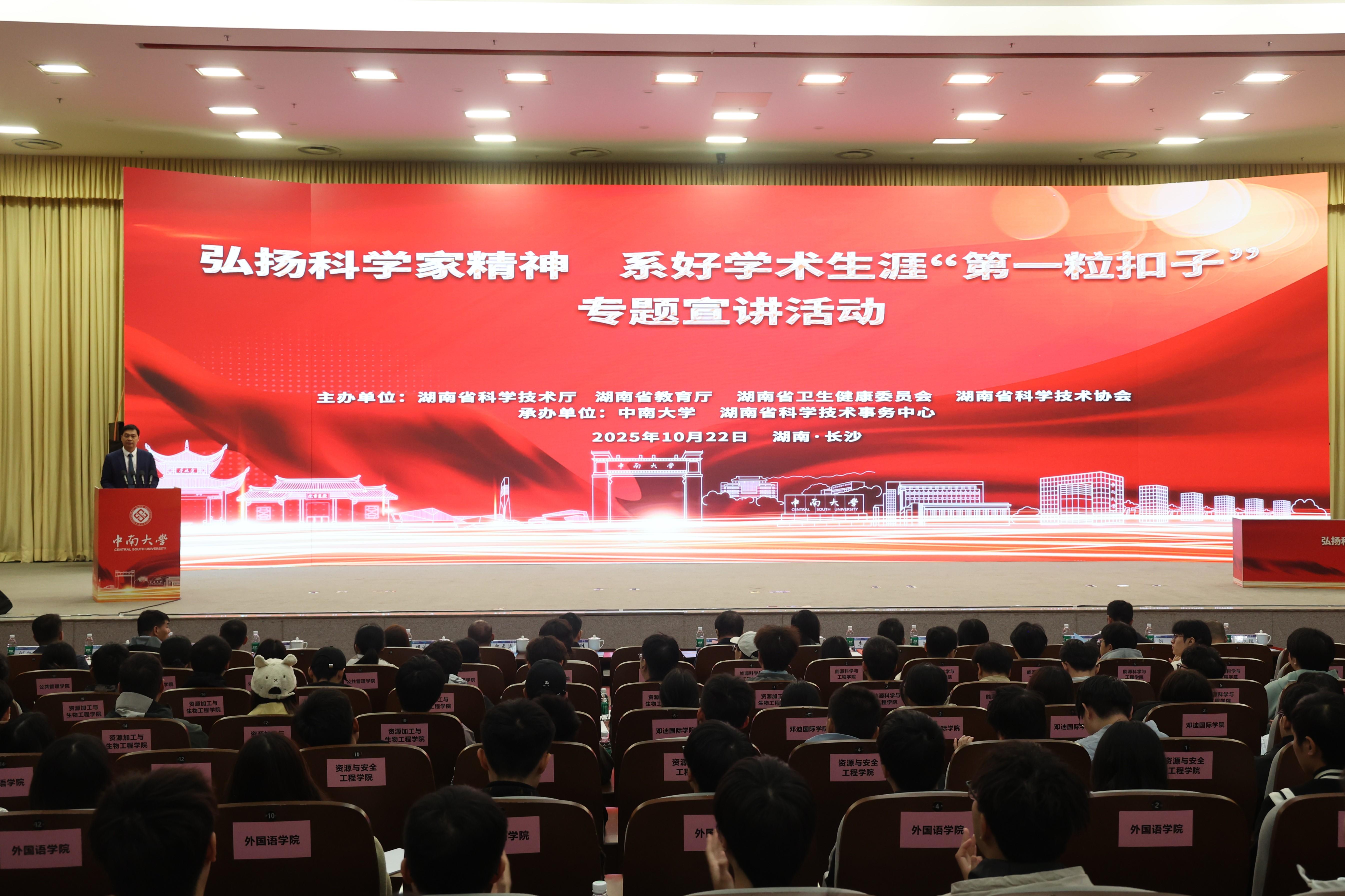 10月22日,湖南省2025年度“弘扬科学家精神 系好学术生涯‘第一粒扣子’”专题宣讲活动在中南大学举行。中国工程院院士、中南大学教授赵中伟作主题宣讲,分享科研心得与家国情怀。