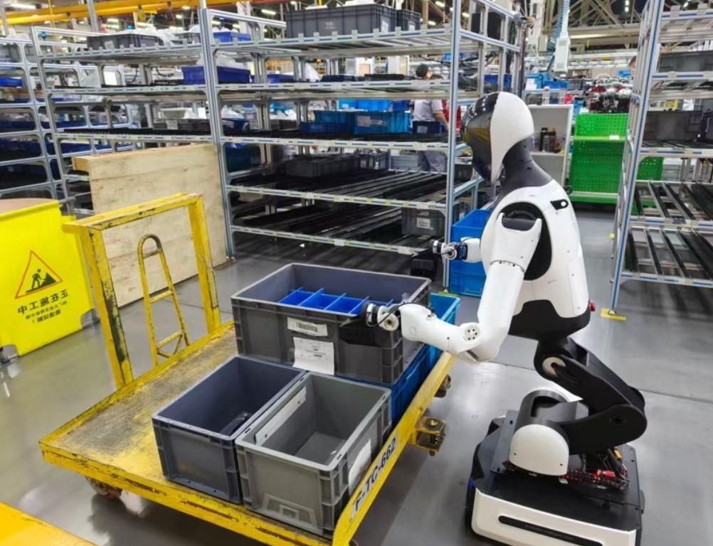 技术落地成果显著,9月起“具身天工2.0”“天轶2.0”已进入福田康明斯工厂,自主完成8—12千克料箱的取放、搬运,适配不同货位高度与料箱种类,通过真实生产场景验证。“具身天工Ultra”还在李宁实验室模拟人类跑步姿态采集数据,破解传统测试局限。