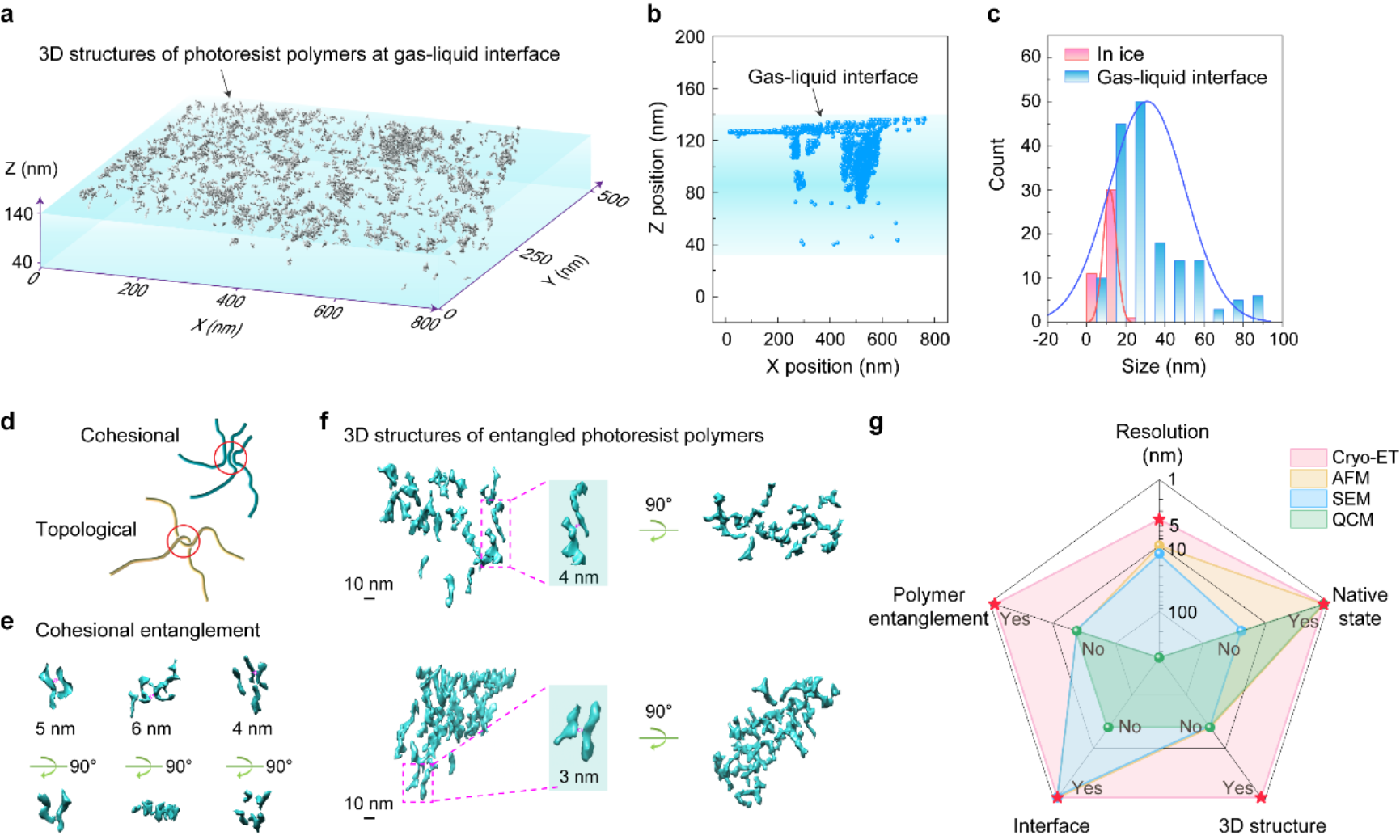 该技术带来诸多新发现。论文通讯作者之一、北京大学化学与分子工程学院高毅勤教授介绍,以往业界认为溶解后的光刻胶聚合物主要分散在液体内部,然而三维图像显示它们大多吸附在气液界面;团队还首次直接观察到光刻胶聚合物的“凝聚缠结”,其依靠较弱的力或者疏水相互作用结合;而且,吸附在气液界面的聚合物更易发生缠结,形成平均尺寸约30纳米的团聚颗粒,这些“团聚颗粒”正是潜在的缺陷根源,它们容易沉积到精密的电路图案上,让本该分开的电路连在一起。