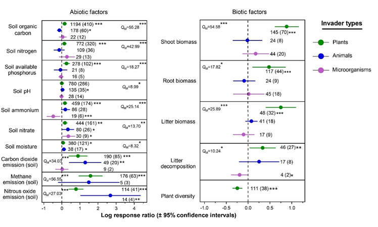 研究团队汇总分析了全球775项研究数据,涵盖超过2200个效应值,主要包括植物、动物、微生物这三类入侵者对15项关键生态系统属性的影响,最终构建了迄今为止最全面的“入侵生态影响数据库”。