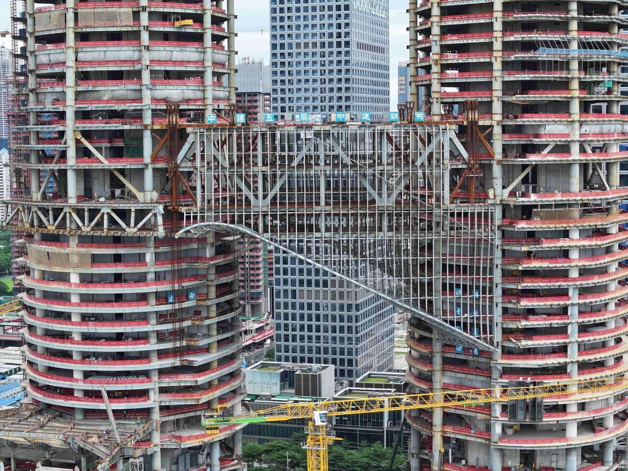 10月24日,由中建五局承建的深圳湾超级总部基地C塔项目钢结构连廊顺利提升至119.15米并成功合龙,项目东、西两座塔楼顺利“牵手相连”,标志着C塔项目建设进入新阶段。