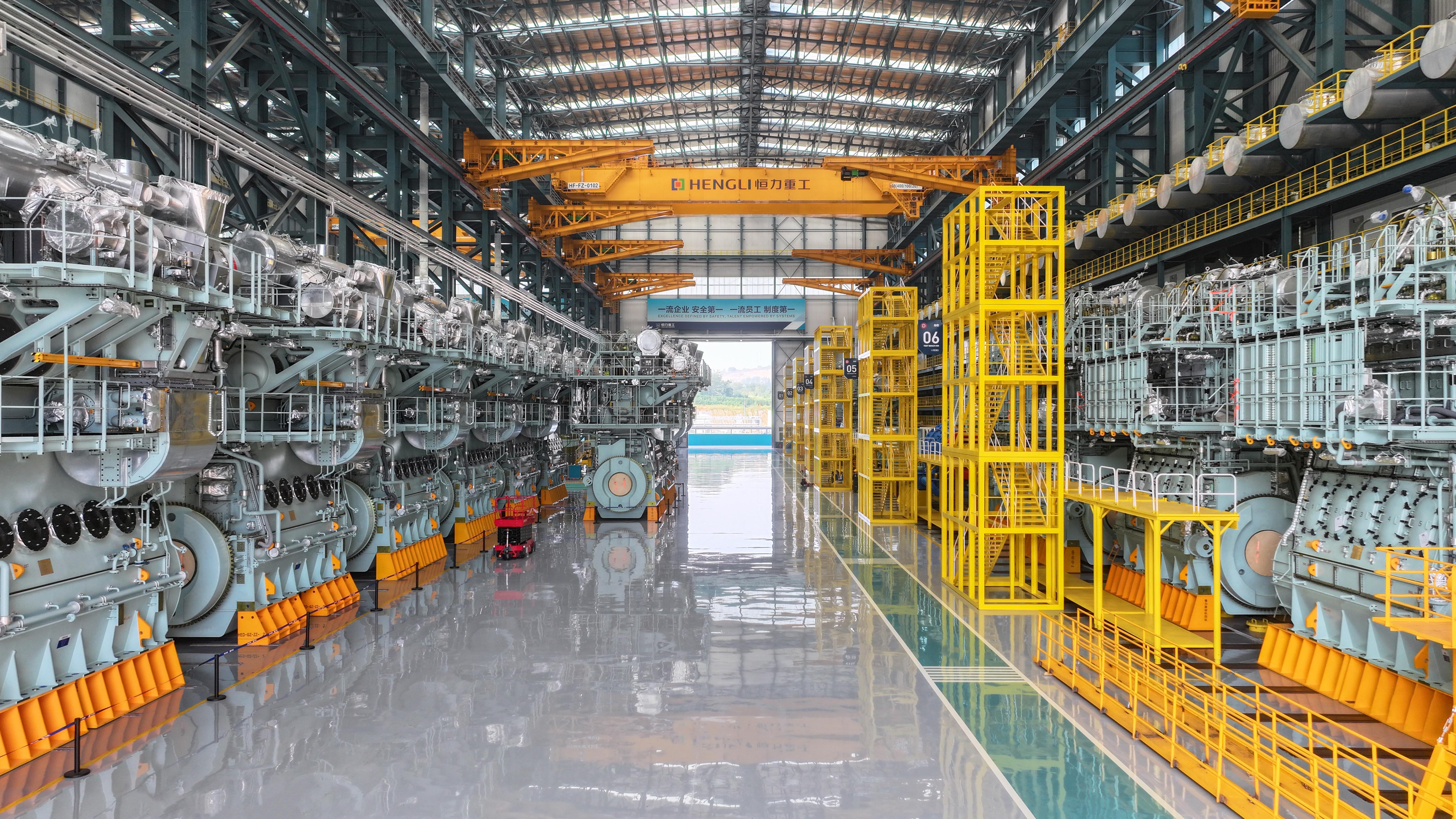 陈汉伦说,恒力重工核心部件高端船用发动机总装项目已入选国家“两重”建设项目,可建造G95主机及以下机型,实现LNG、LPG、甲醇、氨四种双燃料全覆盖,在绿色船舶新赛道,占据先发优势。恒力重工当前在建的所有超大型集装箱船,都采用LNG发动机,均由恒力发动机自主制造。