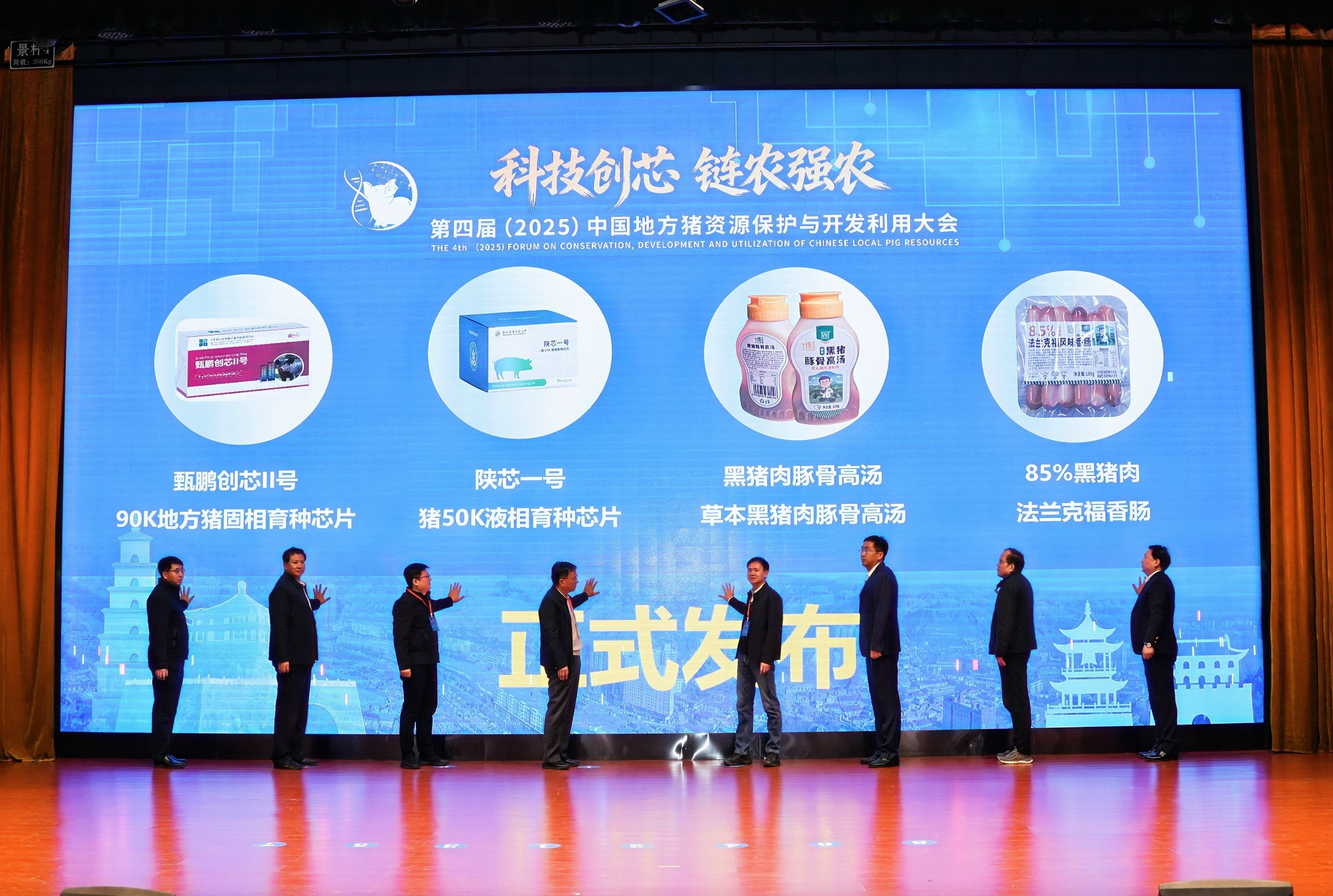 大会上,集中展示发布了一批推动产业发展的技术与产品。由中国农业科学院“猪基因组设计育种”创新团队开发的首款完全自主知识产权的中国地方猪90K固相育种芯片“甄鹏创芯Ⅱ号”发布,西北农林科技大学生猪产业科技创新团队同期发布了“陕芯一号”——猪50K液相育种芯片。同时,清涧亿蓬食品有限公司发布了采用高压提取技术制成的黑猪肉豚骨高汤系列产品以及黑猪肉法兰克福香肠。大会现场完成了三项合作协议的签署。“中国地方猪肉品鉴会”同期举行。
