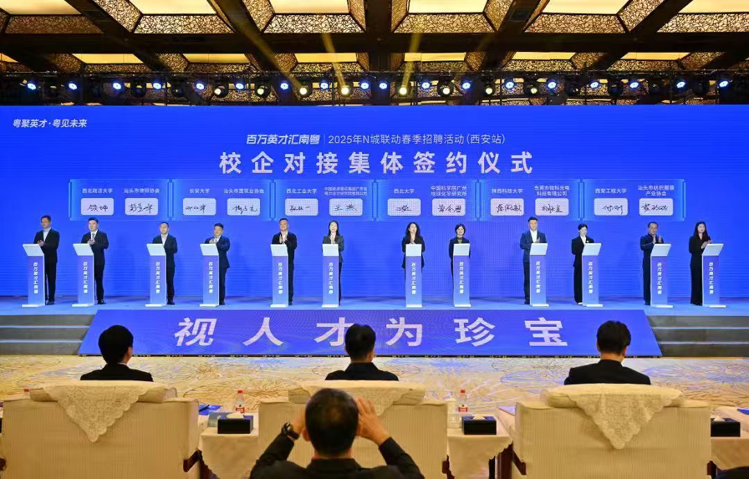 今年4月,“百万英才汇南粤”2025年N城联动春季招聘活动(西安站)在此启动。作为承办方,汕头牵头搭建起粤陕人才对接的桥梁,汇聚广东省200多家企事业单位,带来超1.5万个现场招聘岗位、1.1万个实习见习岗位,同步上线超22万个线上岗位。更以“产业势能+文化动能+服务效能”三维体系为支撑,推动政校企深度协同,活动上共有6对校企成功签约,为这场产才之约播下合作种子。