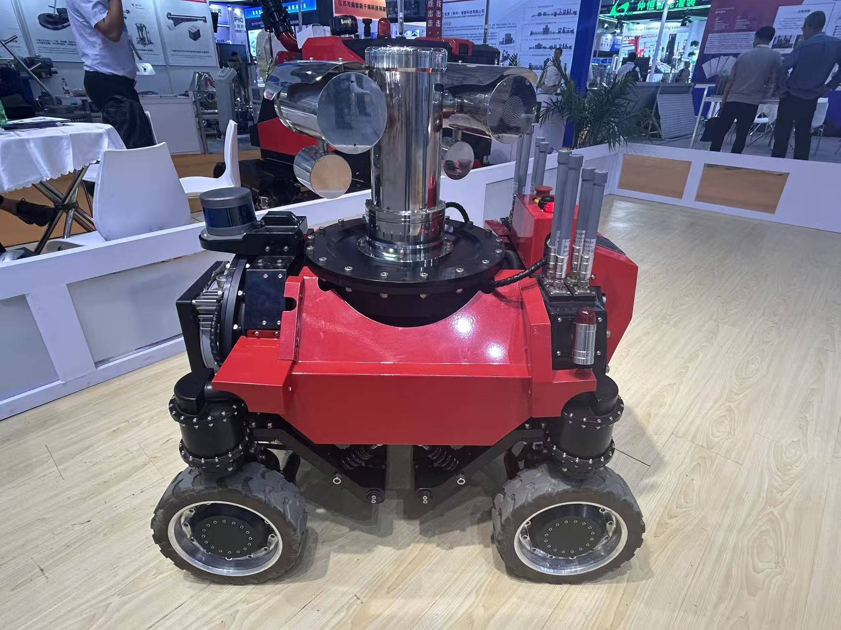 在设备端,防爆机器人广泛应用于高危环境下的巡检工作。在山东国兴智能科技股份有限公司展台,一台红色的防爆轮式巡检机器人引人注目。它具有可见光图像识别、红外热成像测温、气体浓度检测等功能,可深入化工企业危险区域作业。该公司石化事业部销售总监王永健介绍:“这款机器人搭载3D激光雷达和四轮驱动系统,可应对各种复杂路况,具备设备缺陷自动诊断、环境设施智能运维、隐患排查等功能,可大幅度降低一线高危作业人员危险指数和劳动强度。”