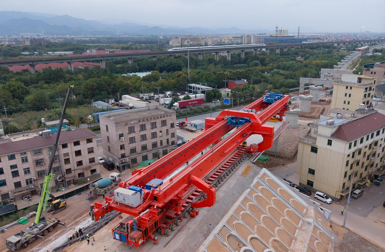 金华铁路枢纽扩容改造工程总概算投资约245亿元,建成后将进一步畅通浙江铁路主干网,优化综合货运布局,推动金华加快建设内陆开放枢纽中心城市与国际陆港枢纽,助力浙江高水平打造“交通强省”和长三角一体化高质量发展。在箱梁架设过程中,相关参建单位面临标段全线207孔箱梁的制运架重任以及多次上跨杭长高铁、沪昆普铁的高风险挑战。