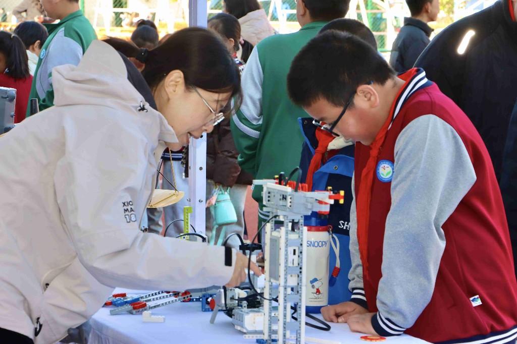 启动仪式后,形式多样的表演点燃全场。植保无人机携环保花瓣与泡泡上演“珍珠花雨”,机器狗身披舞狮服饰随音乐变换队形,300架无人机编队升空呈现科技节主题字样,赢得阵阵喝彩。随后,交流展示、无人机竞赛、科学家进校园三大板块同步开展,270名学生在无人机障碍赛、无人机足球等9个竞赛项目中角逐,在企业展位体验无人机、人工智能等前沿科技成果。