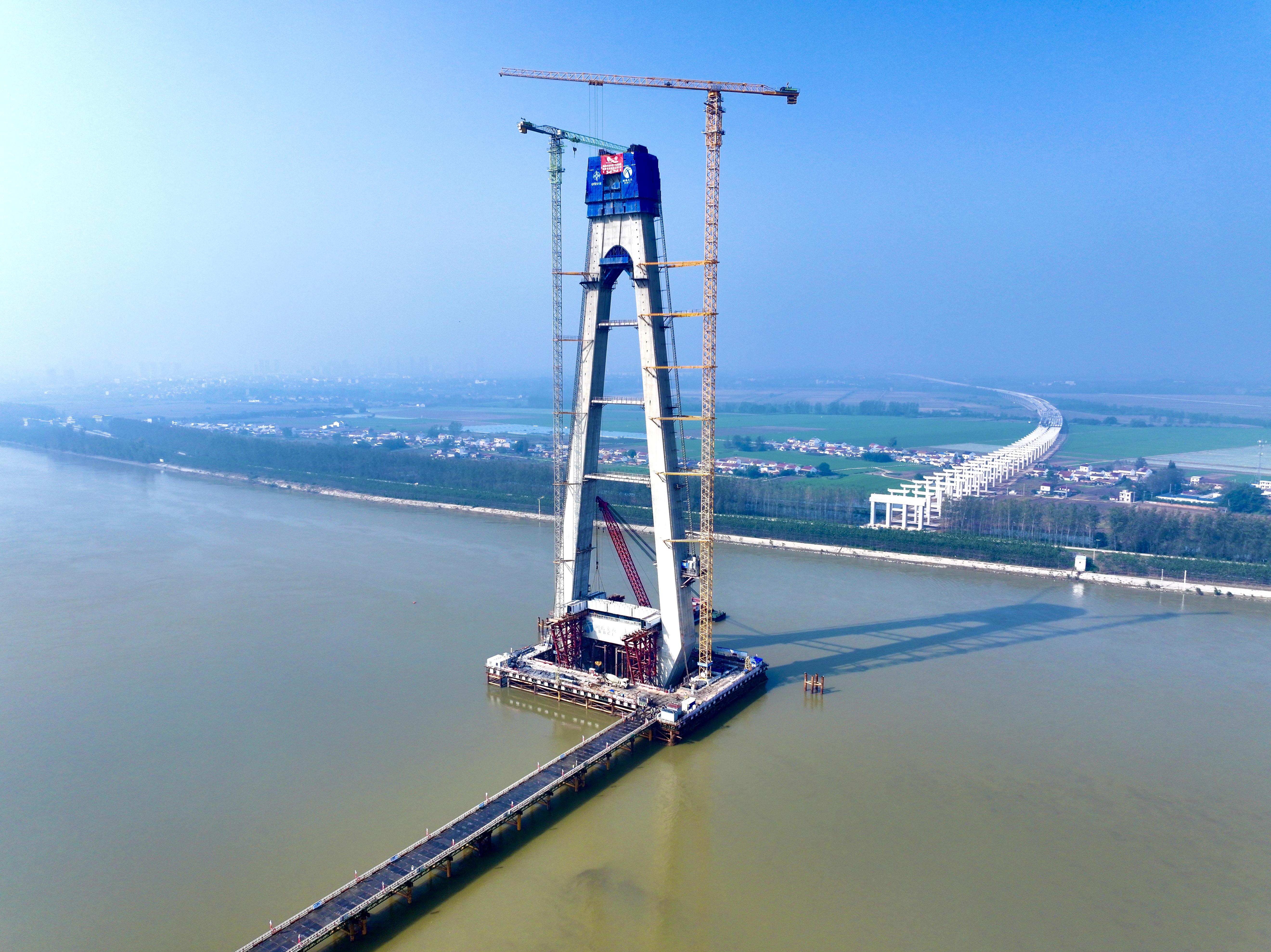 汉江特大桥全长660米,是国内最大跨径无辅助墩组合梁独塔斜拉桥。大桥主塔设计为钻石型结构,由塔座、下塔柱、下横梁、中塔柱、塔顶连接部和塔冠等组成,高度相当于一座60多层的摩天大楼,采用液压爬模施工,共分33个节段。