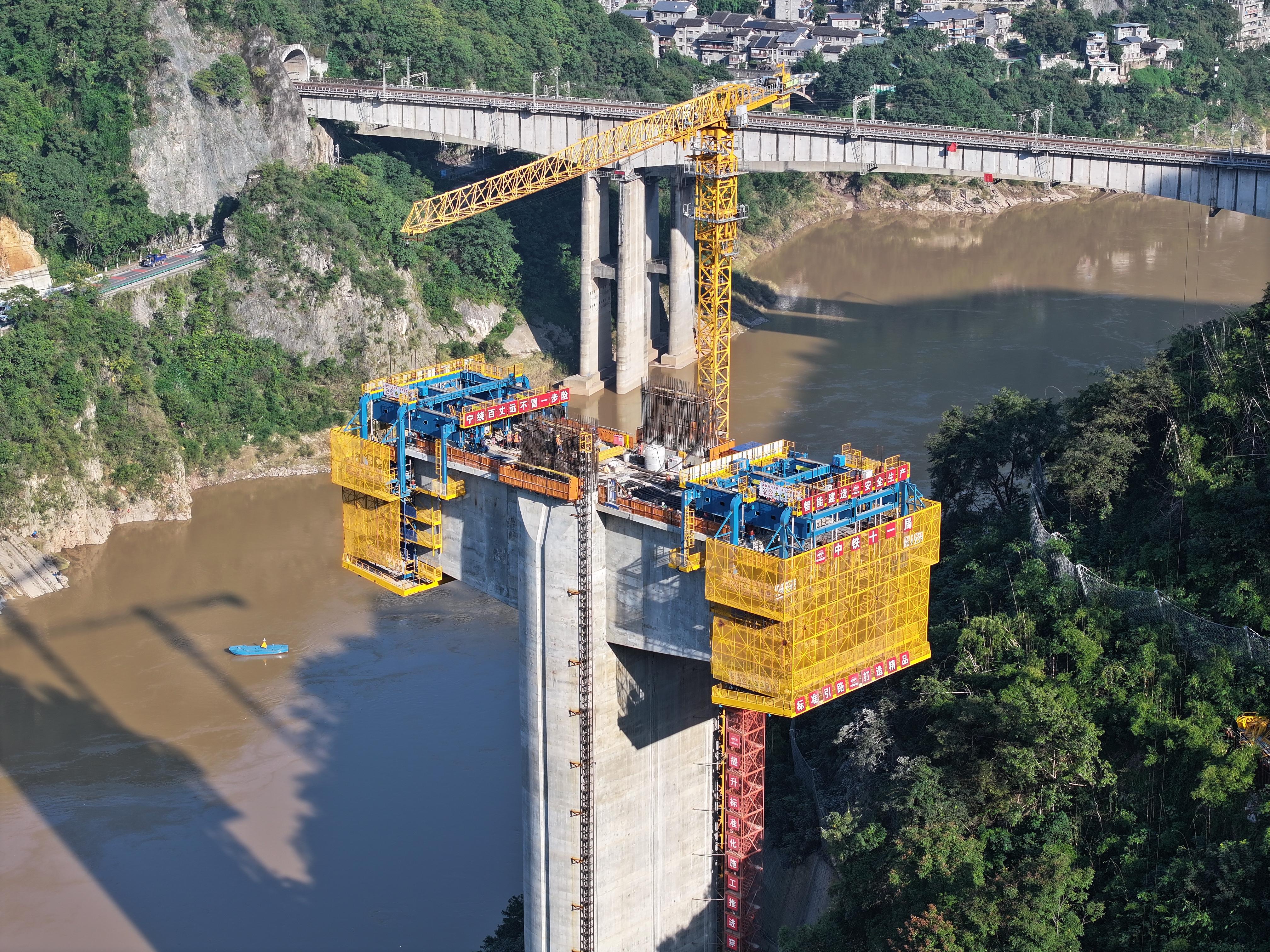 在智慧悬臂造桥机的助力下,西渝高铁北碚天府嘉陵江特大桥悬臂施工工期缩短20%,现场作业人员减少20%,人工成本显著降低,项目实体质量一次验收合格率达到100%。截至目前,西渝高铁北碚天府嘉陵江特大桥14号主墩已完成造桥机安装,15号主墩已完成4号节段浇筑。