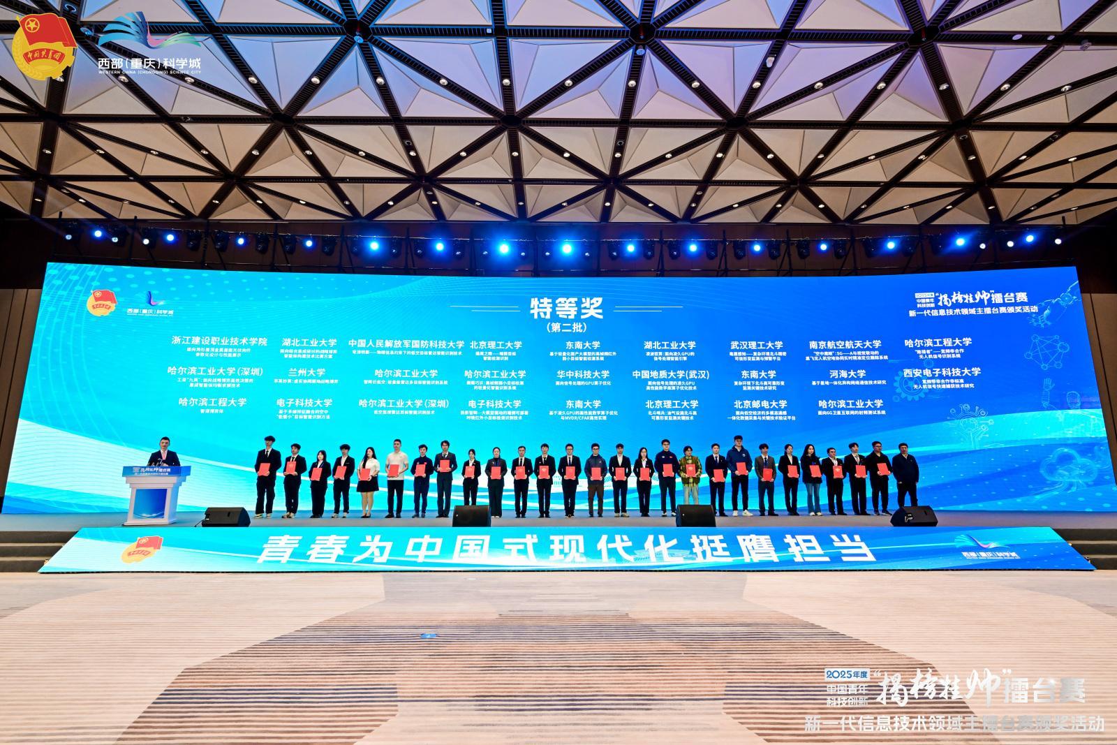 10月28日,2025年中国青年科技创新“揭榜挂帅”擂台赛新一代信息技术领域主擂台赛在西部科学城重庆高新区科学会堂落下帷幕。赛事由共青团中央、中国科协、教育部、中国社会科学院、全国学联联合主办,汇聚全国千余支青年科技团队同台竞技,最终23支团队斩获“擂主”称号,77支团队获特等奖,赛事总奖金超500万元。