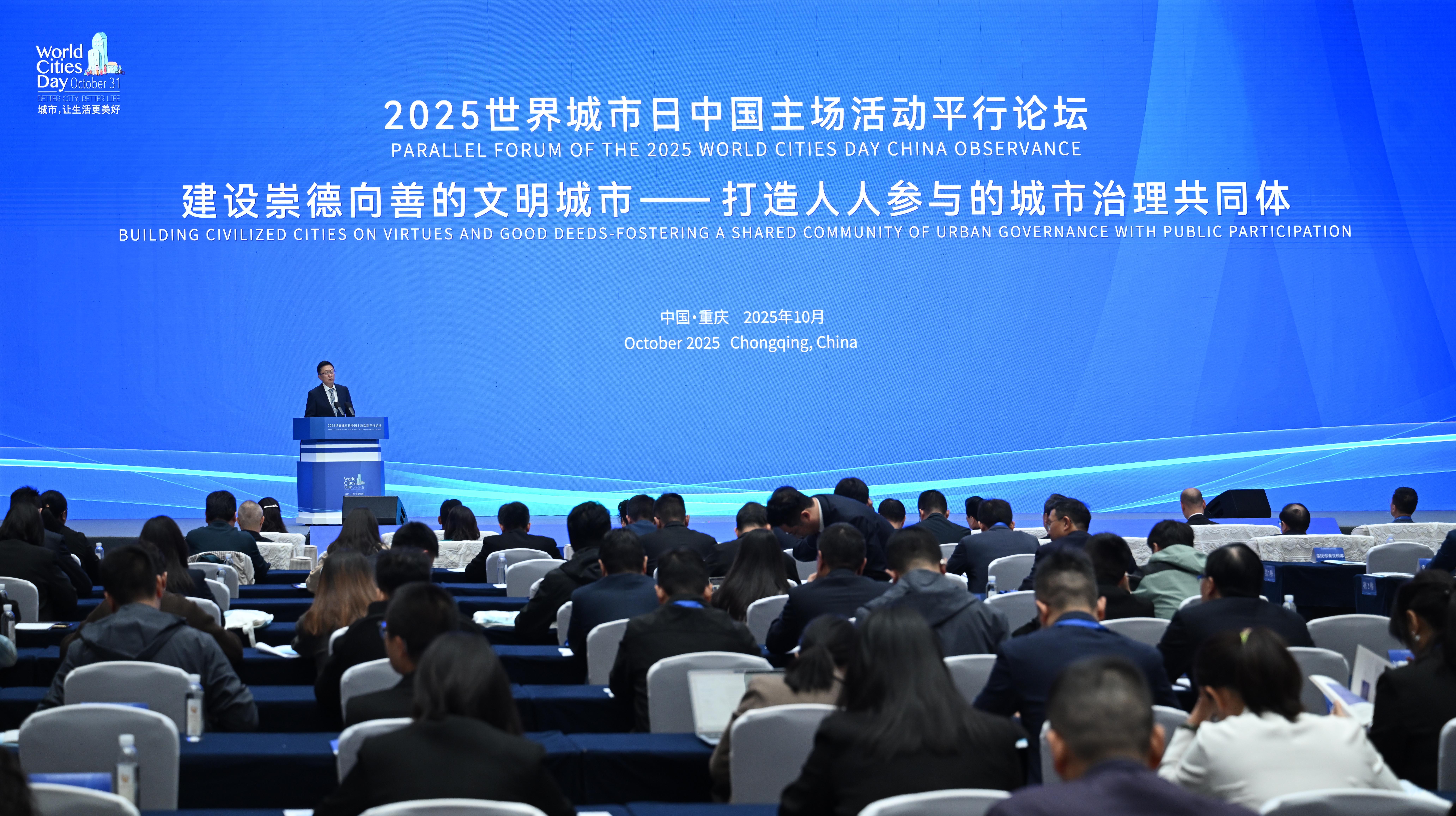 10月29日,“世界城市日中国主场活动——建设崇德向善的文明城市平行论坛”在重庆举行。活动以“建设崇德向善的文明城市——打造人人参与的城市治理共同体”为主题,与会嘉宾聚焦新时代城市治理中多元主体协调机制的创新实践、超大城市现代化文明治理等议题展开交流,共同探讨“人人参与、人人负责、人人奉献、人人共享”的城市治理共同体的建设路径。