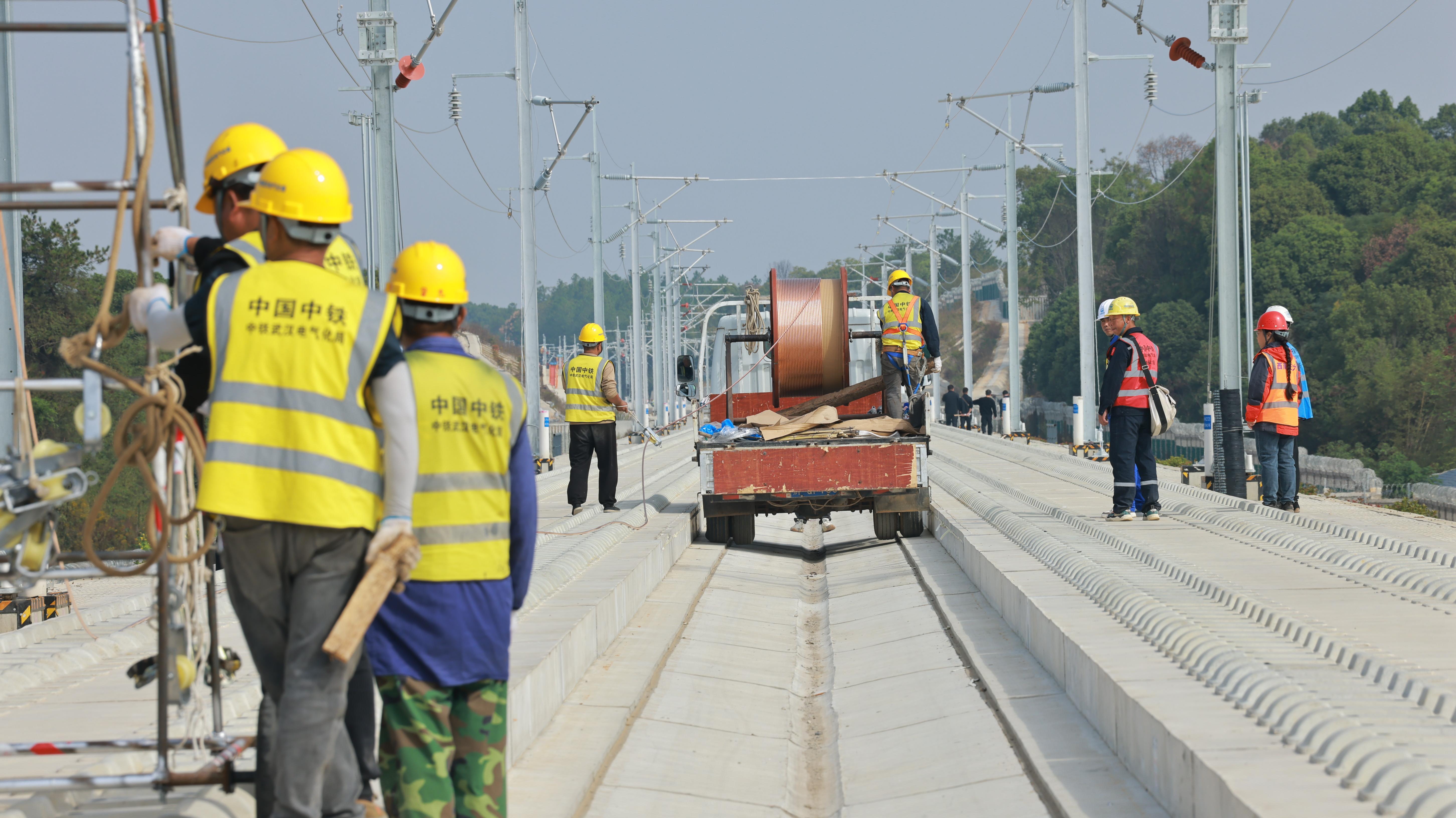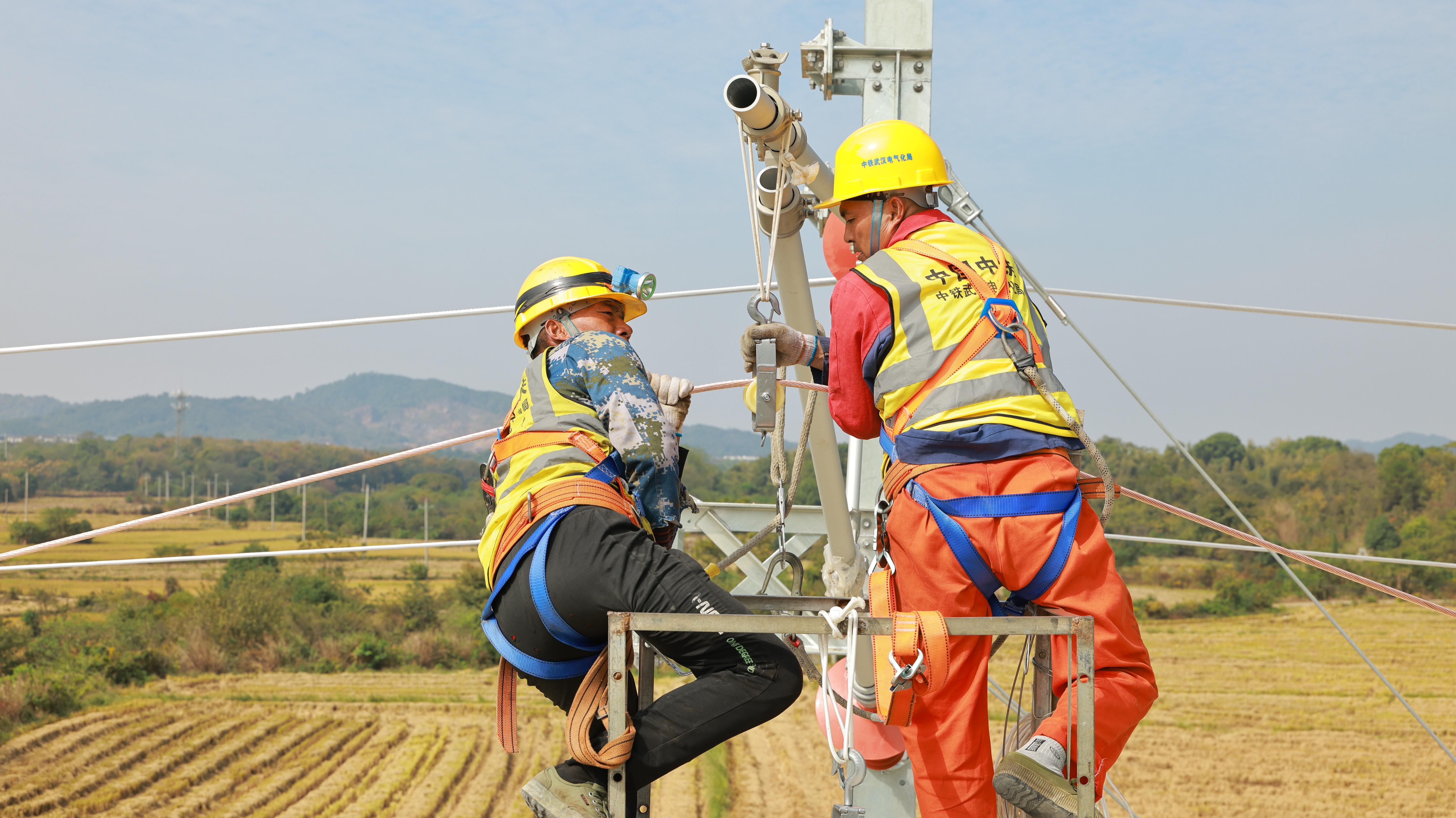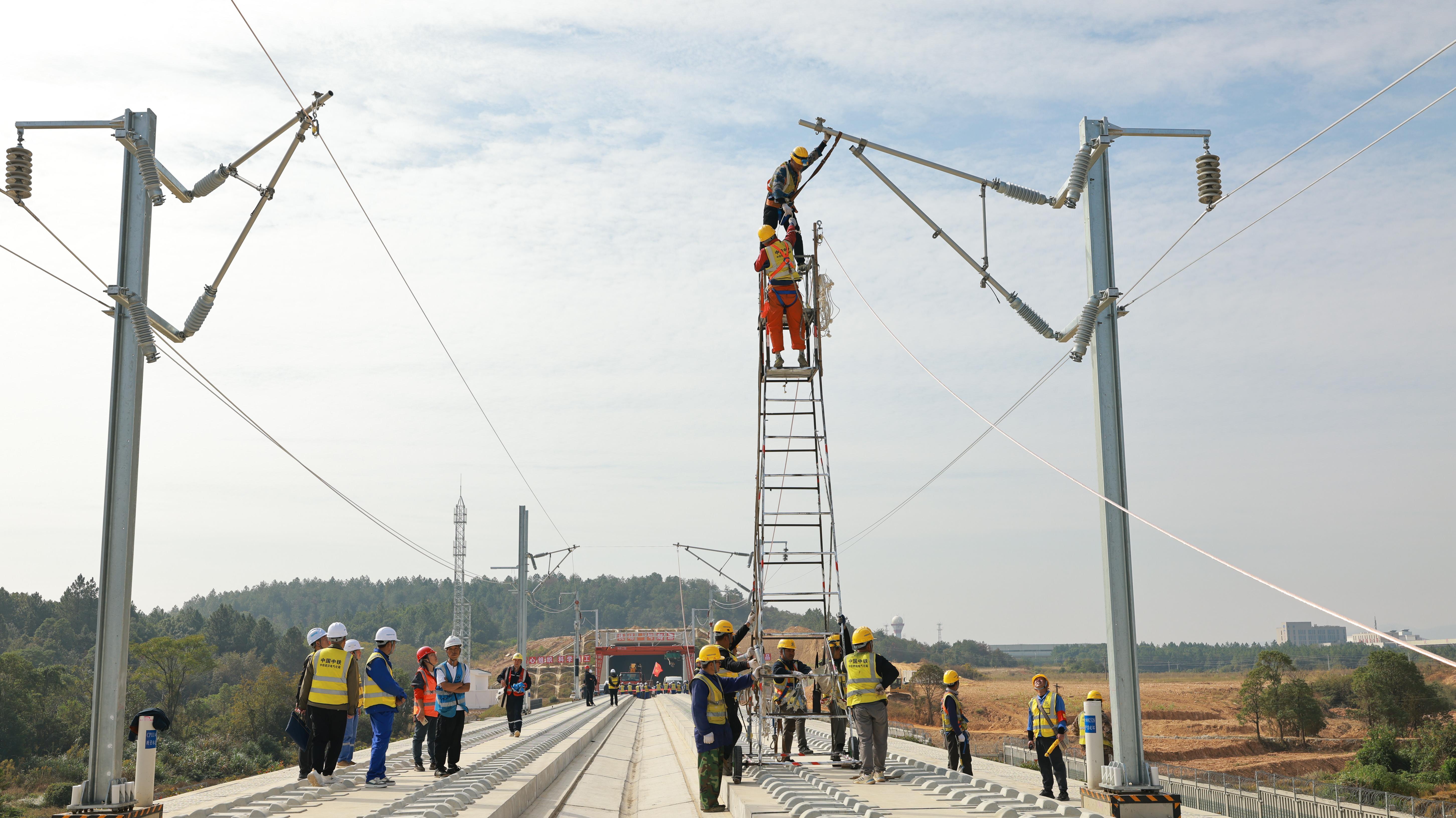 “我们通过BIM技术进行了模拟,如同为工程安装了‘预演沙盘’,确保每一道工序都达到设计标准。”中铁武汉电气化局昌九项目部项目经理石朝军介绍,在挂网架线过程中,建设团队采用了恒张力放线设备,精准控制承力索和接触线的张力和平直度,将线缆的高度和拉出值误差控制在毫米级。