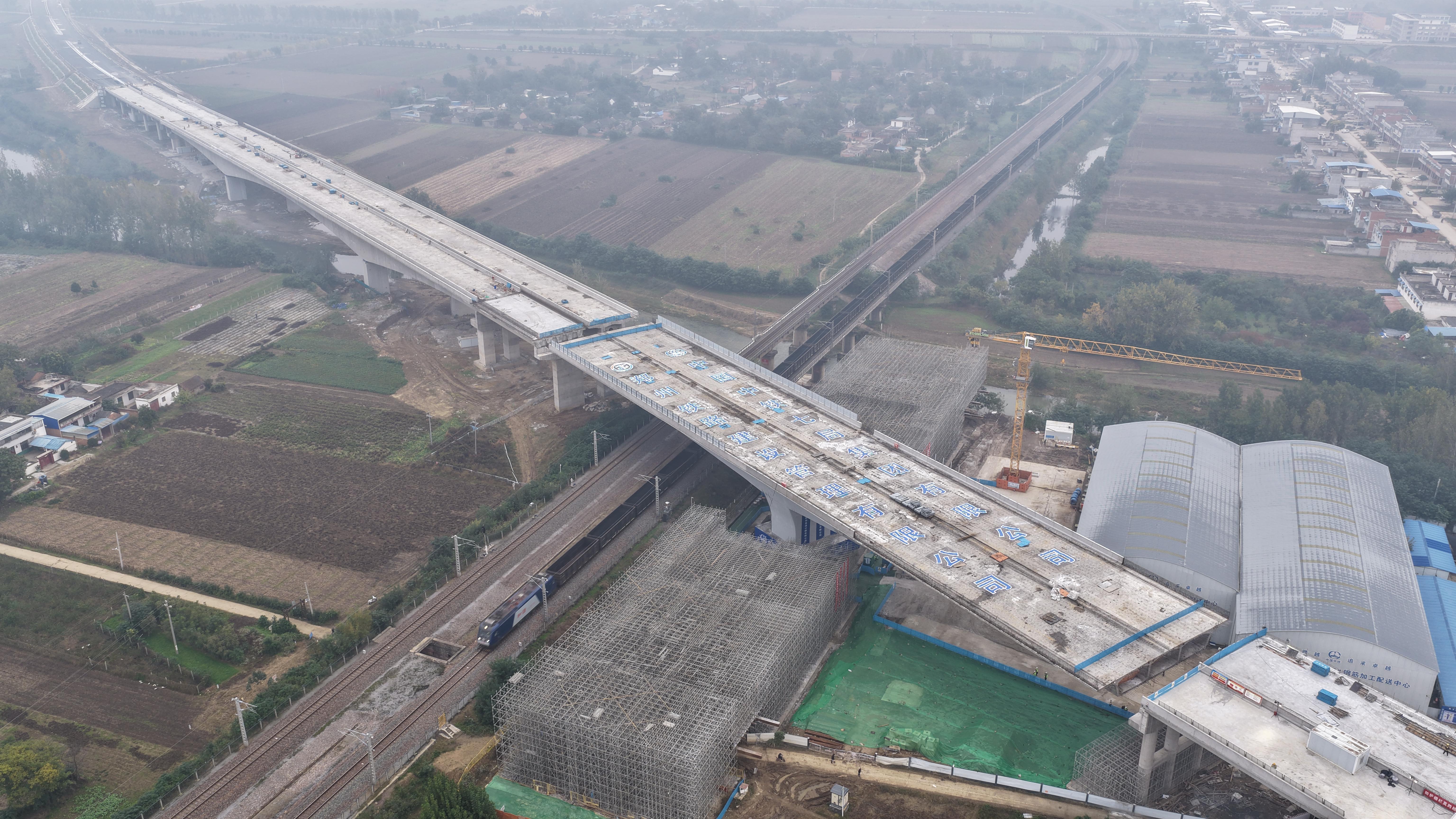 项目由郑州铁路建设管理有限公司代建、中铁七局承建。此次转体的跨焦柳铁路主桥采用(2×85)米T型刚构预应力混凝土箱梁结构,转体部分总重2.4万吨,通过逆时针旋转60.1度精准就位。转体过程中,项目团队应用“智能张拉+环形滑道”技术,依托高精度传感器与智能控制系统,在80分钟铁路施工“天窗期”内完成转体,成功攻克大吨位转体平衡控制、营业线施工安全管控等核心难题,也为我国复杂交通环境下跨铁路桥梁施工积累了可复制的实践经验。