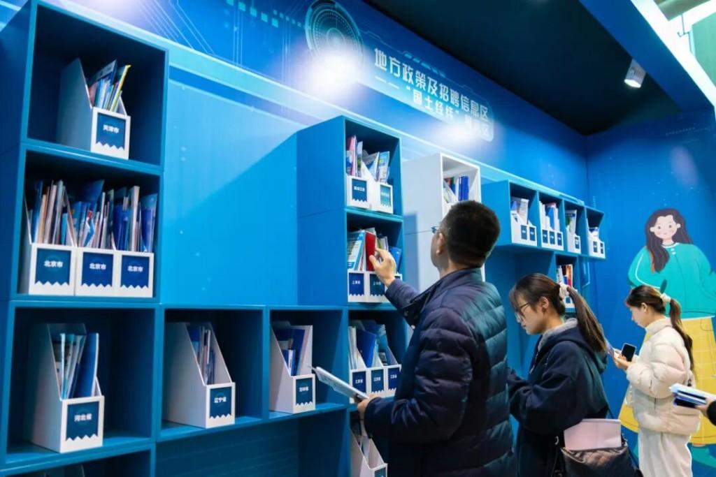 另外,“解惑灯塔”展示区为学生提供关于就业的各种困惑解答,同时设置“生涯树洞”提问箱,收集最真实的学生困惑,并生成专家解答的“解惑卡片”;“强国长廊”展示区设计“旋转行业展示墙”,全面介绍重点行业动态,邀请企业代表为学生进行行业解读和职业咨询答疑;“国土经纬”展示区整合收集各地引才信息,让同学们轻松获取最新招聘信息。