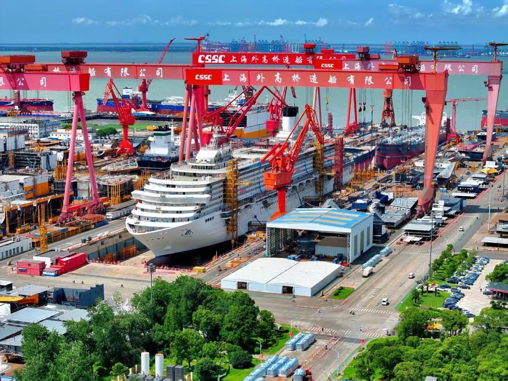 值得一提的是,在中船集团旗下上海外高桥造船有限公司(以下简称“外高桥造船”)2号船坞内,第二艘国产大型邮轮“爱达·花城号”已进入舾装阶段。相较于首艘“爱达·魔都号”,其全船贯通工期缩短两个多月。作为全球唯一可同时建造民用船舶、海工装备和大型邮轮的企业,外高桥造船树立起中国船舶工业节拍化、批量化、高效率建造的新标杆。