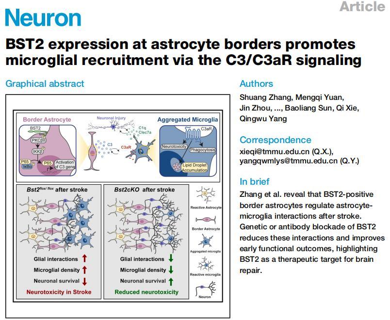 脑卒中后,大脑内一场“看不见的战争”正在上演——星形胶质细胞形成的“边界结构”并不仅仅是物理屏障,而是积极参与炎症调控的“指挥中心”。10月30日,记者从陆军军医大学新桥医院获悉,该院神经内科杨清武教授团队在《神经元》上发表研究,首次揭示干扰素诱导蛋白BST2在边界星形胶质细胞中的关键作用,并阐明其通过C3/C3aR信号通路“招募”小胶质细胞、加剧神经损伤的新机制。这一发现为脑卒中后早期抗炎治疗提供了新的靶点与策略。