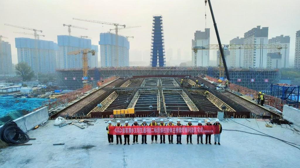 记者从中铁六局获悉,10月31日,我国首座单索面矮塔曲面菱形塔身斜拉桥——彭家寨乡互联互通项目施工二标段上跨京广铁路主塔顺利封顶。工程由中铁六局承接,这一关键节点的完成,标志着项目涉铁工程从基础施工转入上部结构攻坚阶段,为后续斜拉索挂设、调索及箱梁转体施工奠定坚实基础,对完善邯郸市中心城区交通路网意义重大。