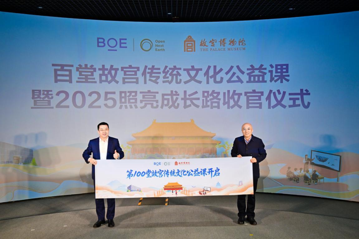 近日,BOE(京东方)“百堂故宫传统文化公益课”暨2025照亮成长路收官仪式在北京举行。故宫博物院是BOE(京东方)“照亮成长路”公益项目的合作伙伴,2023年双方携手启动“百堂故宫传统文化公益课”项目,依托智慧教育解决方案与数字技术,为偏远地区教育高质量发展注入科技活力,以数字化形式推动文化传承。