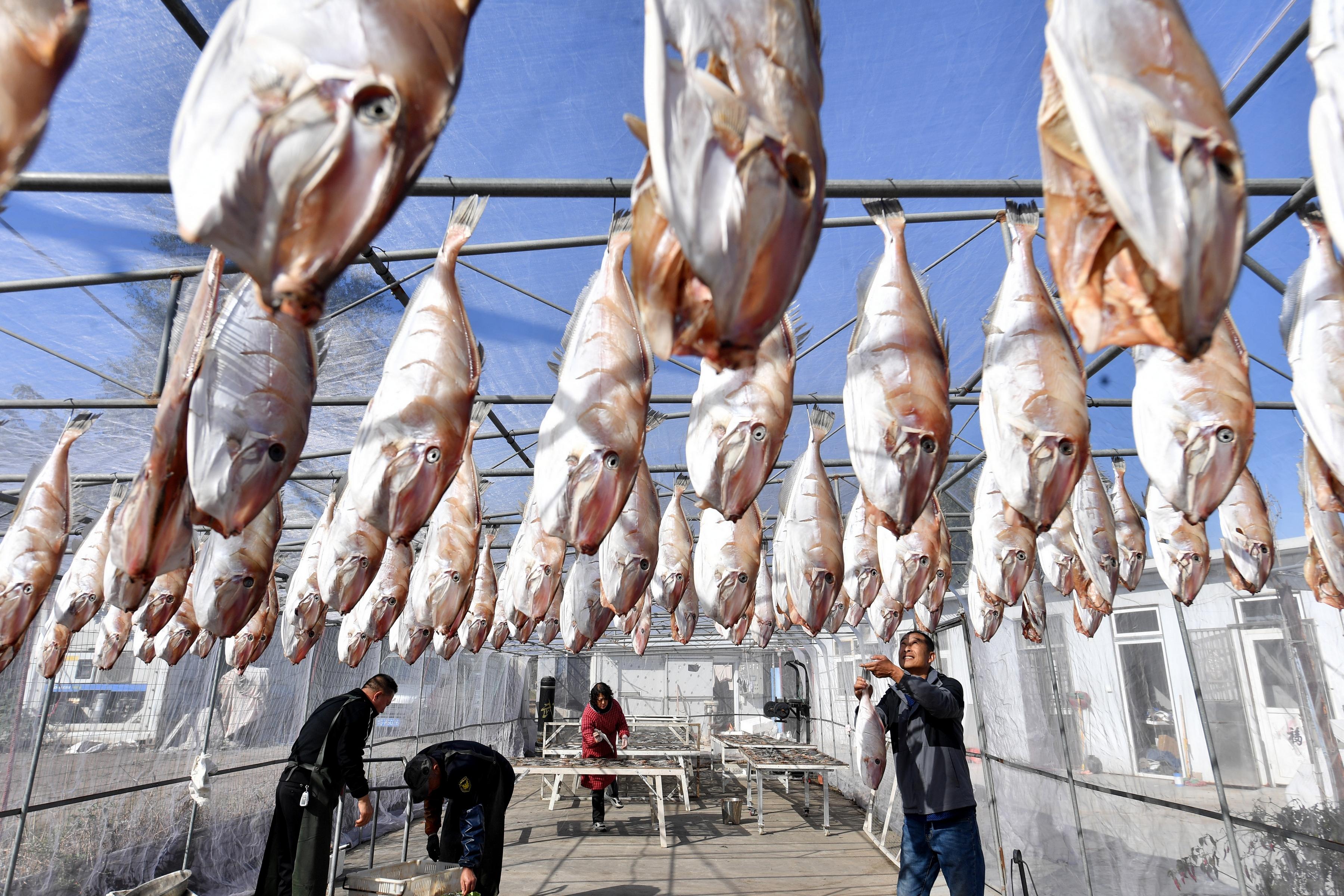 眼下,在青岛市城阳区上马街道东程社区,当地传统特色的“一卤鲜”风味鱼干进入最佳晾晒时期,渔民通过“选、割、卤、晒”四道工序加快生产,经市场预订和电商+直播销往各地,促进增收。