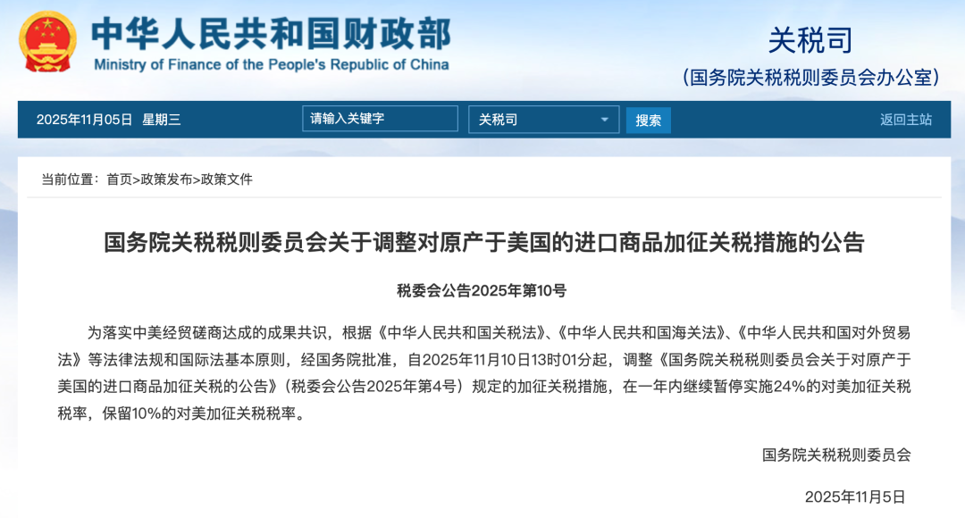 为落实中美经贸磋商达成的成果共识,根据《中华人民共和国关税法》、《中华人民共和国海关法》、《中华人民共和国对外贸易法》等法律法规和国际法基本原则,经国务院批准,自2025年11月10日13时01分起,调整《国务院关税税则委员会关于对原产于美国的进口商品加征关税的公告》(税委会公告2025年第4号)规定的加征关税措施,在一年内继续暂停实施24%的对美加征关税税率,保留10%的对美加征关税税率。