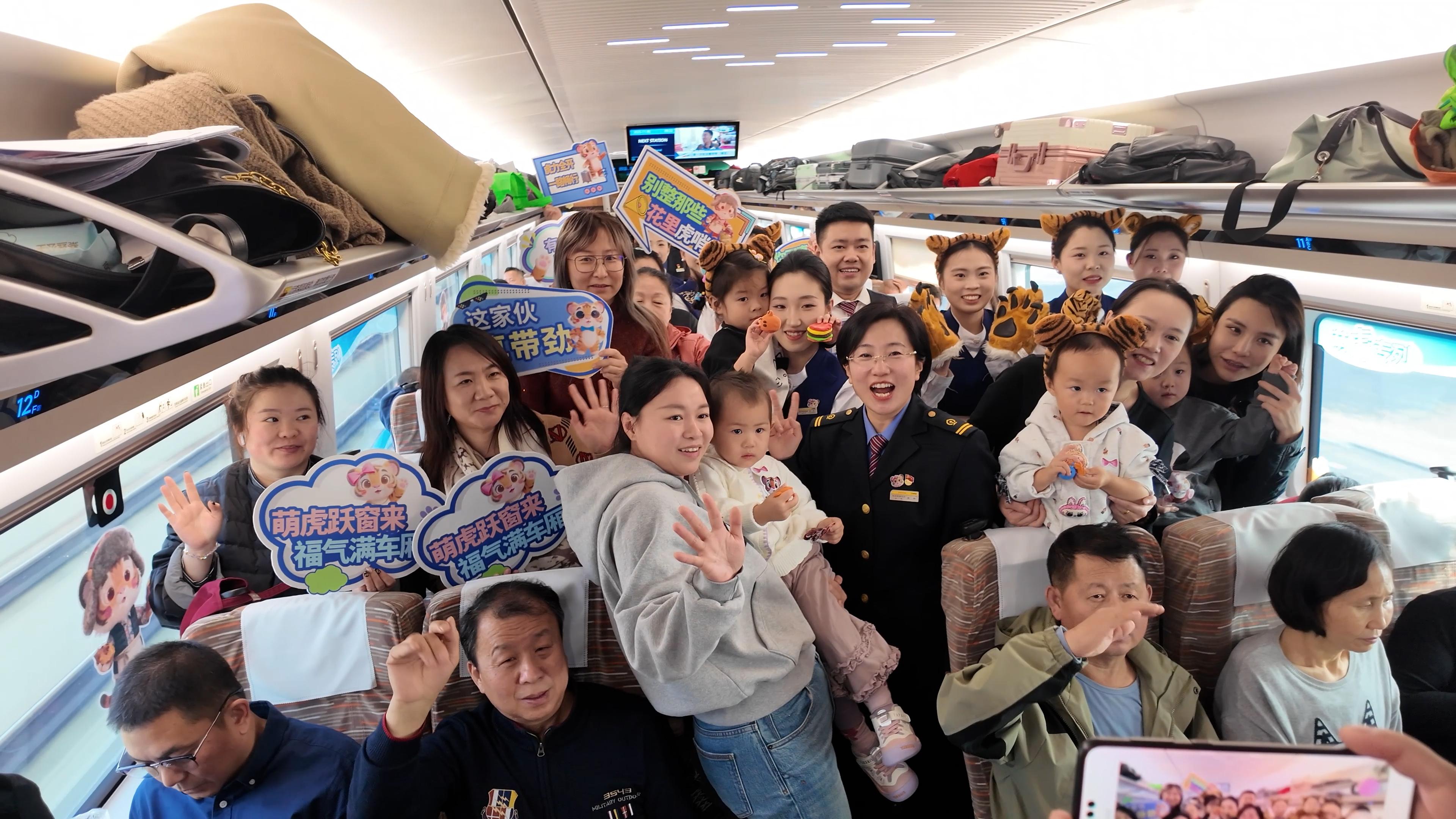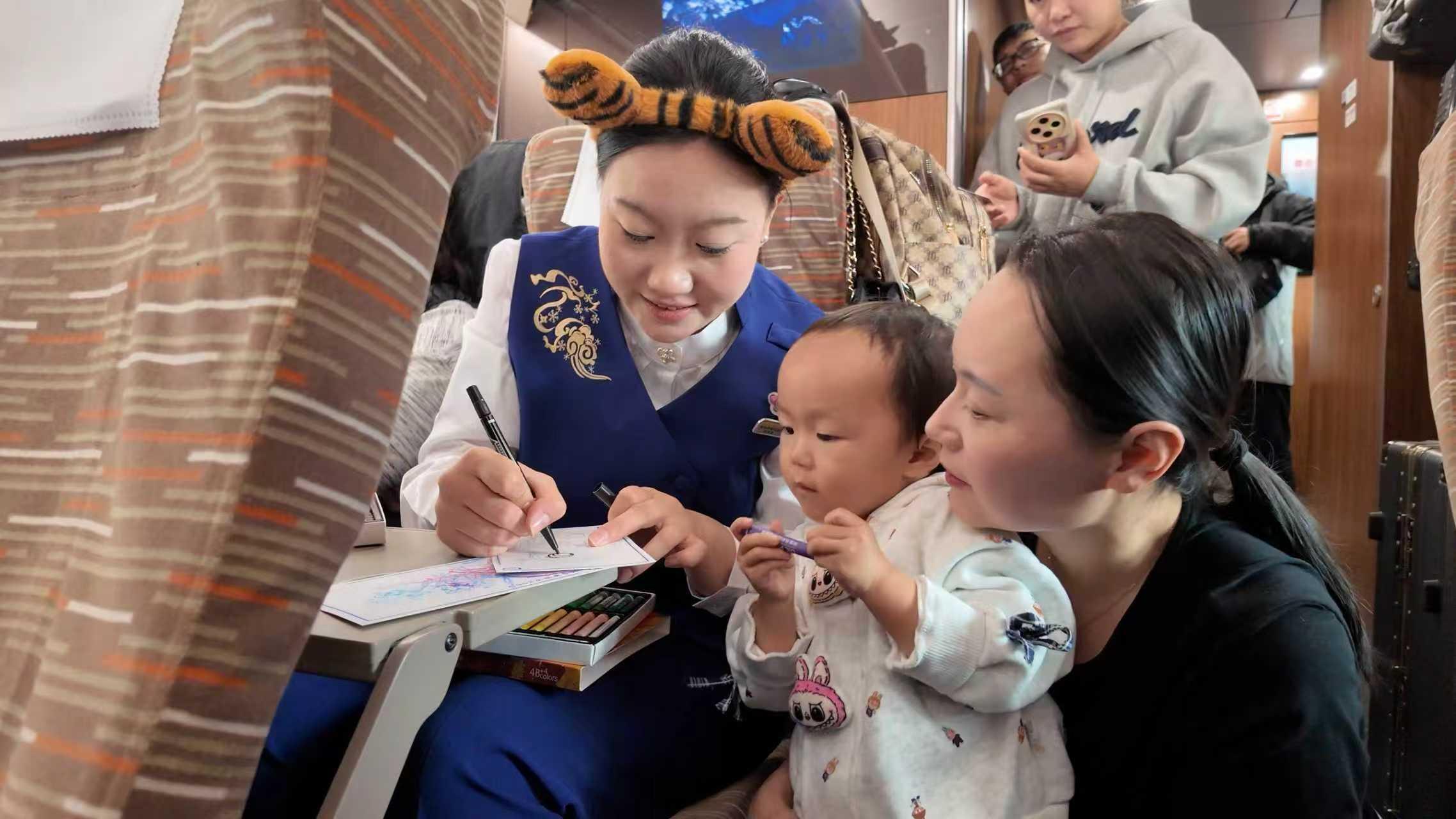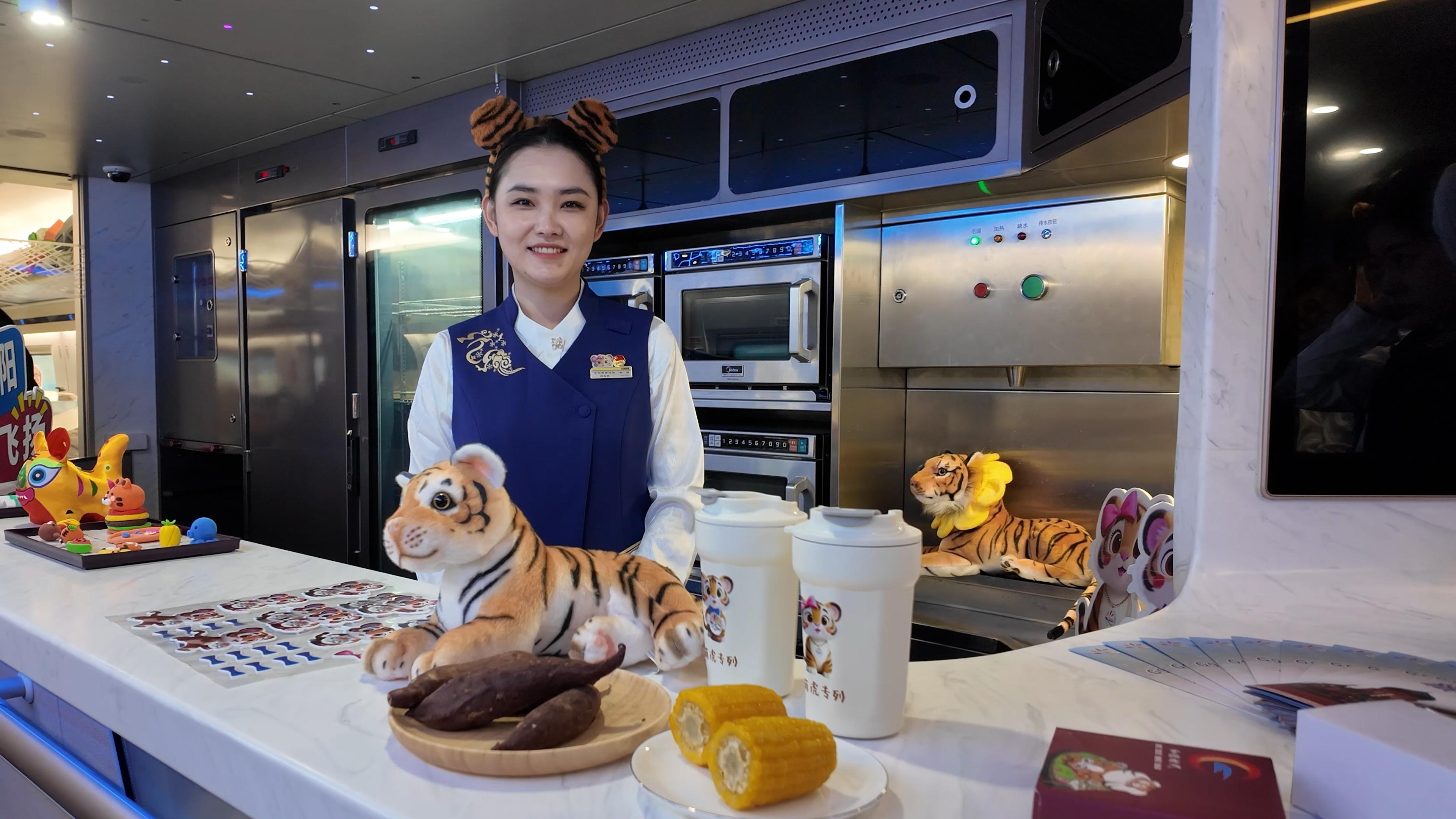 车厢内,特色功能区为旅客提供了丰富的文化互动。“东北虎非遗馆”邀请剪纸艺人现场教学,旅客可亲手制作虎形窗花;造型可爱的虎形手办、虎纹饼等泥塑也备受青睐。乘务人员佩戴虎形徽章,随车讲解科普知识,并组织互动活动,旅途氛围温馨愉悦。