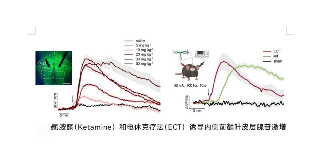 研究团队借助基因编码腺苷探针GRABado和光纤光度测量技术,实现了小鼠脑区腺苷浓度的实时监测。实验发现,氯胺酮和电休克治疗均能快速且持续升高小鼠内侧前额叶皮层与海马体的腺苷水平,而这一区域正是情绪调节的关键脑区。通过遗传学与药理学验证,研究团队确认腺苷A1和A2A受体是抗抑郁效应的必需条件,敲除或阻断这两种受体后,两种疗法的抗抑郁作用均完全消失。