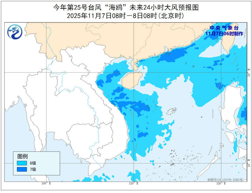 中央气象台今早已解除台风黄色预警。但受“海鸥”残余环流和南下冷空气的共同影响,7日8时至8日8时,台湾海峡、巴士海峡、南海北部和西部及东沙群岛、西沙群岛、南沙群岛西部、琼州海峡、北部湾将有5到7级风、阵风8级。