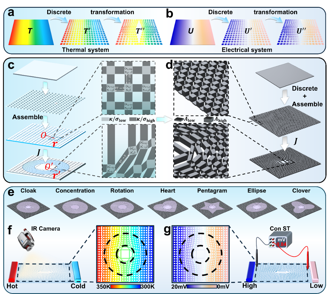 “这类似于用乐高积木搭建复杂结构。”论文通讯作者赵刚教授解释道,“通过精巧的几何设计,让连接‘桥’的截面远大于单元本身,确保了能量在传输时高效且不失真。最关键的是,在这个统一的‘骨架’上,我们无需改变材料本身,只需像下棋一样重新排布这些单元的位置和形态,就能命令电场和热场‘听指挥’,实现多种功能。”