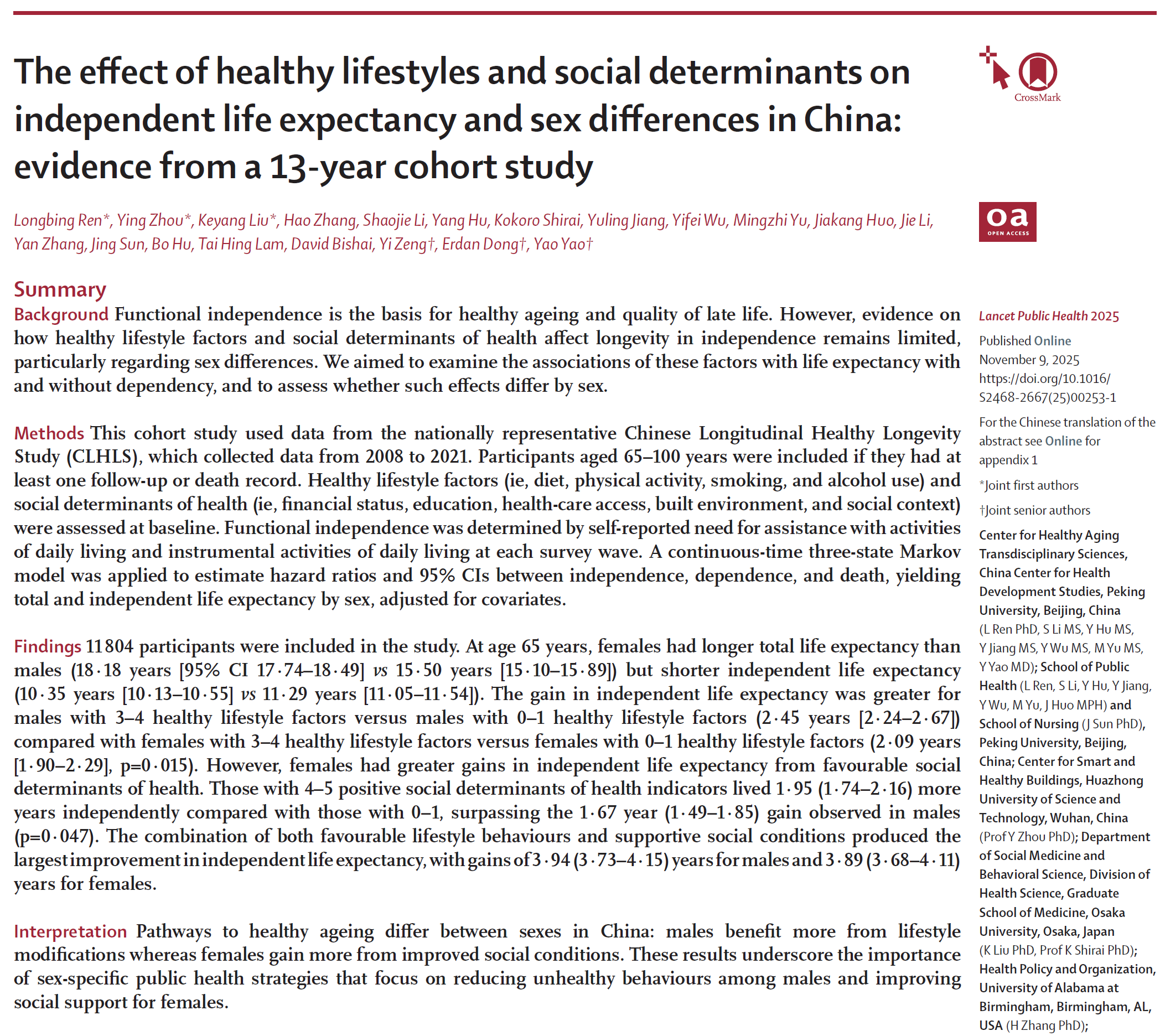 11月10日,北京大学董尔丹院士、曾毅教授、姚尧研究员团队联合华中科技大学、大阪大学、香港大学、伦敦政治经济学院等国内外多家高等院校在国际权威期刊《柳叶刀・公共卫生》在线发表研究成果。专家团队通过对全国1.1万余名老年人长达13年的追踪分析,发现女性虽然预期寿命更长,但面临更长的失能期,健康老龄化路径存在显著的性别差异特征,提示应该实施差异化的健康干预策略。