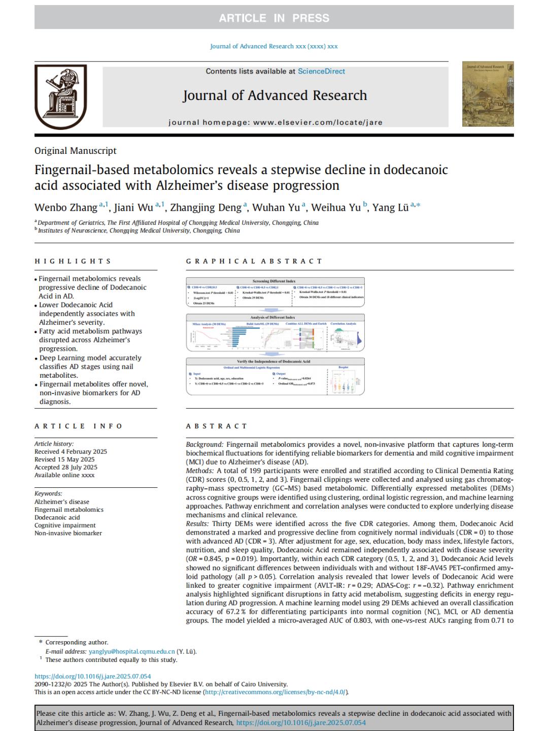 研究人员利用巴渝认知队列的数据库,纳入199名受试者,采集受试者指甲样本,开展相关研究分析。最终的研究结果表明,指甲代谢组学可作为无创、可规模化、反映长期代谢状态的检测新路径。其中,月桂酸的持续下降贯穿疾病各阶段,兼具进展提示与风险分层价值。