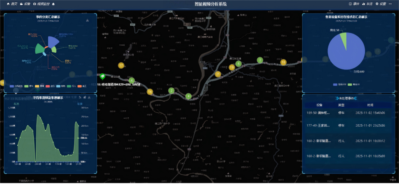 据介绍,智慧感知平台具备AI图像检测技术,对全线700路监控图像,可即时预警、报告拥堵、逆行、停车、行人、施工等异常事件,同时,可重点监测21处风险点位,聚焦桥梁、隧道、高边坡、立交互通等重点部位。节日假期,巴万高速杨柏服务区车容量基本达到饱和,存在拥堵情况,30秒内,智慧感知平台AI异常事件检测系统自动预警,当班监控员接到预警后,随即通知高速交警、执法、管护队前往现场进行疏导。监控中心同时加强了杨柏至通江路段沿途照明,对拥堵路段可变情报板发布警示信息,提示司乘人员前方服务区拥堵,为解决现场拥堵,提供了信息支持。数据显示,智慧感知平台让交通事故数下降37%,交通事故处置效率提升56%,交通安全治理能力提升42%。