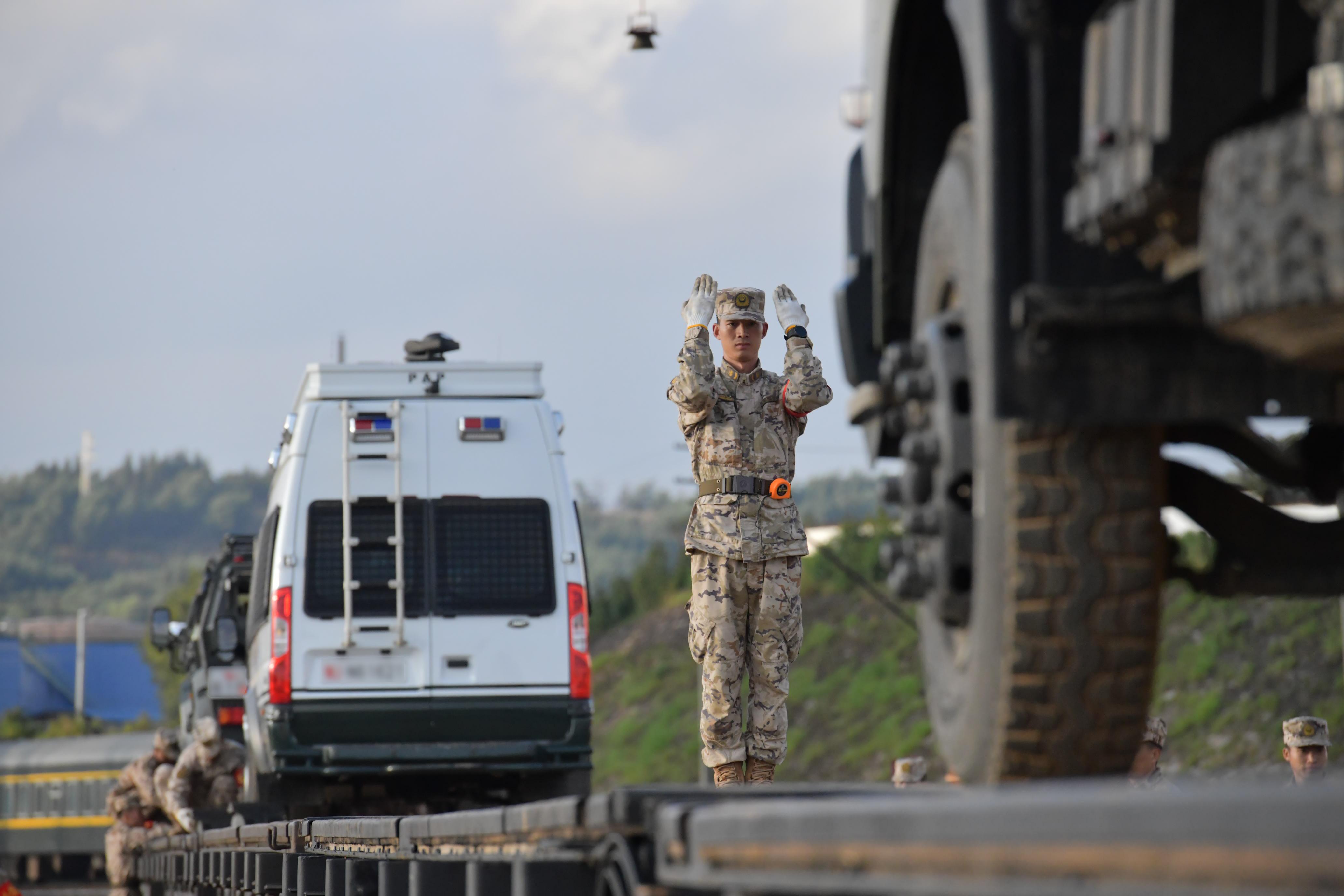训练现场,随着指挥员一声令下,各作业组迅速前出,按预定方案展开行动。在引导员的精准指挥下,一辆辆车辆缓缓驶向列车平板。引导员全神贯注,不断通过手势和口令引导驾驶员修正方向、调整车位,确保数十吨重的装备分毫不错地停靠在指定位置。车辆稳固后,捆绑加固组官兵立即上前,运用三角木、紧固器等器材,对车辆进行快速、规范的捆绑加固。整个作业流程衔接紧密,官兵协同默契,现场紧张有序。