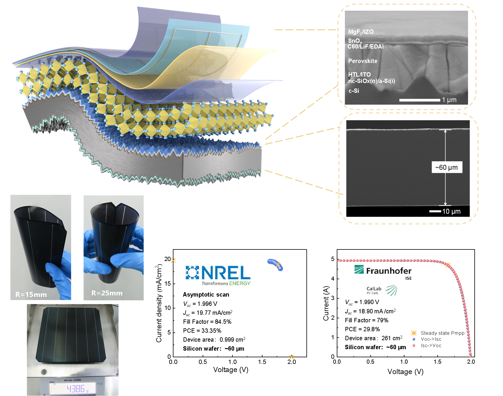 基于该技术,研究团队研制出厚度仅60微米的超薄全硅片柔性叠层器件,不仅实现了近30%的转换效率,还可实现对折,弯曲半径达1.5厘米,重量不到4.4克,单位重量功率高达1.77瓦/克。实验室小面积器件效率经美国国家可再生能源实验室认证达到33.4%。