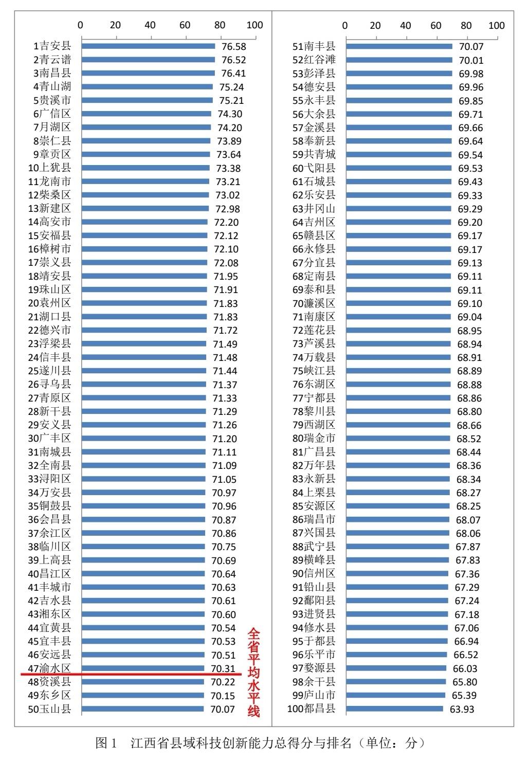 近日,江西省科学院发布《2024年度江西省县域科技创新能力评价报告》(以下简称《报告》)。《报告》显示,江西全省综合科技创新水平进一步提升,100个县(市、区)创新能力的差距进一步缩小,多层次、各具特色的县域创新体系更加完善,有力支撑了江西创新型省份建设。