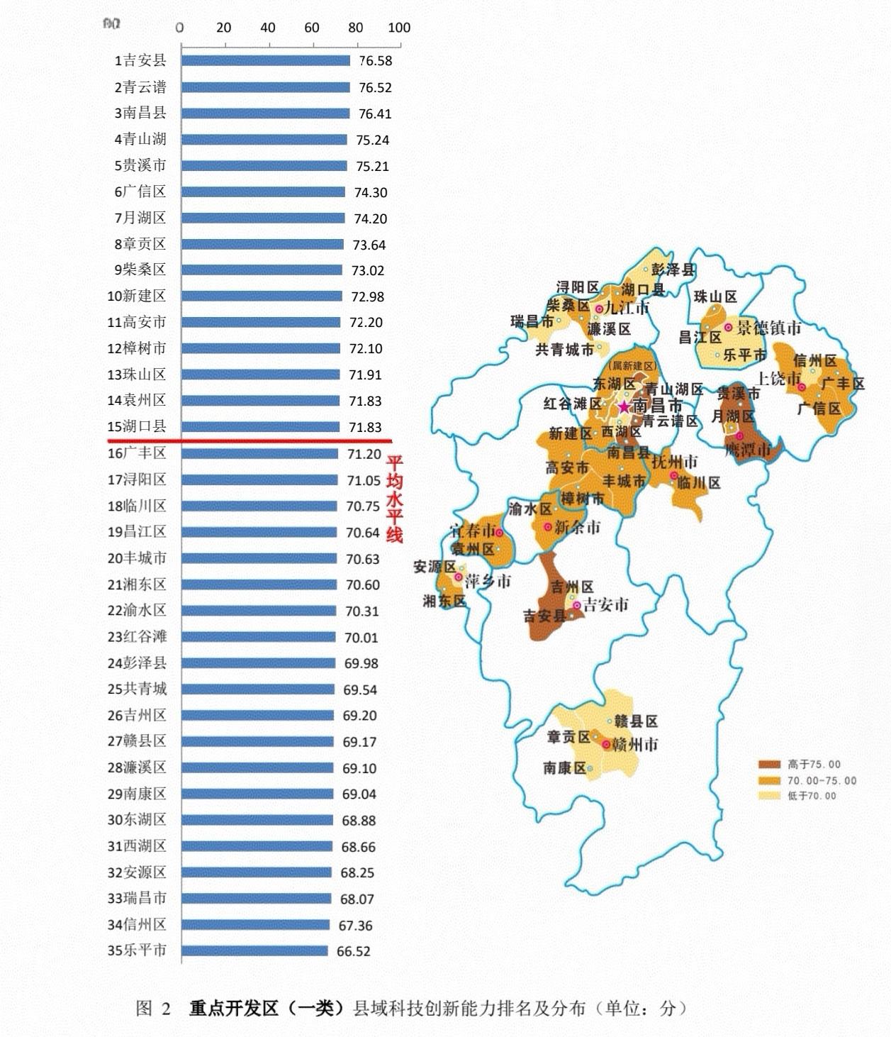从本次评价结果来看,2024年度江西全省县域科技创新能力平均得分为70.23、较2023年度提高0.28,平均得分以上的县(区、市)有47个、较上一年增加2个,得分最高的三个地区依次是吉安市吉安县、南昌市青云谱区、南昌市南昌县。