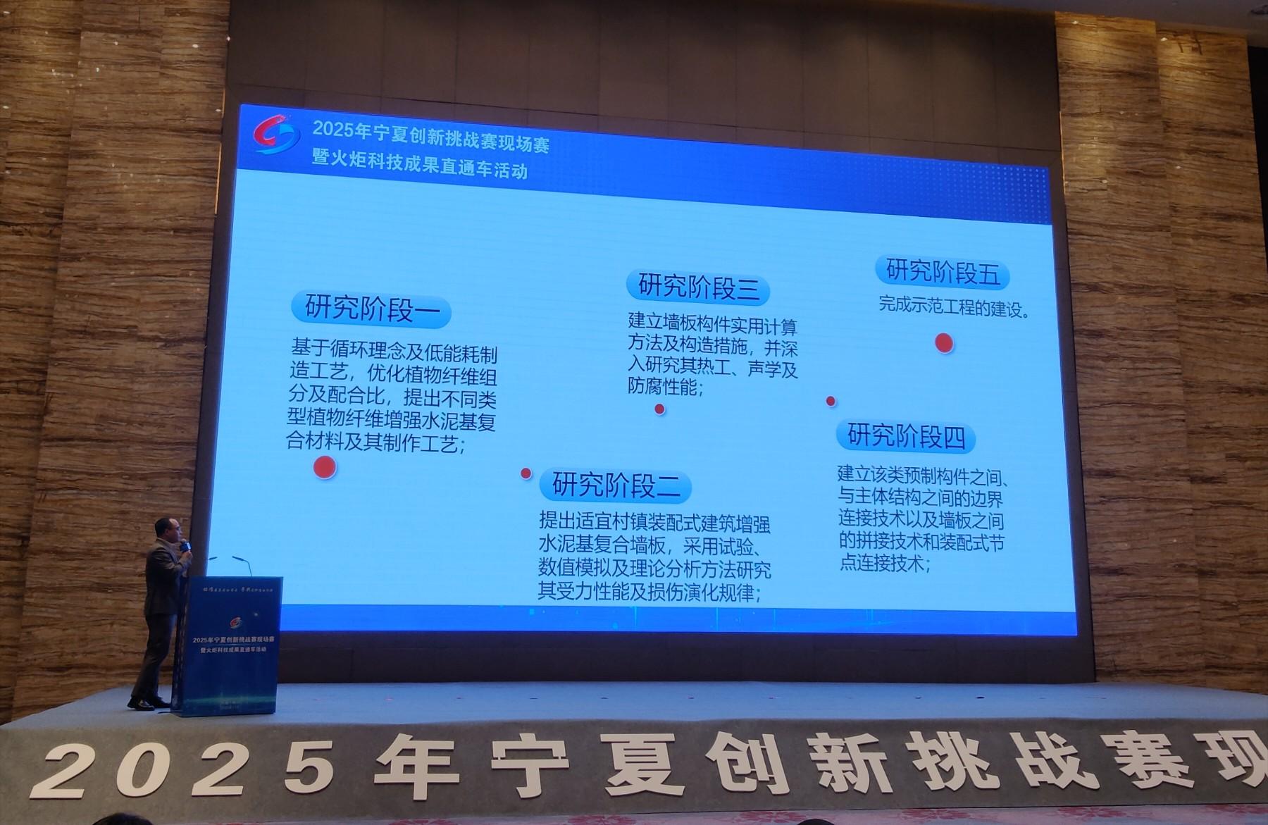 此次,宁夏中盛建材科技有限公司打算寻求一种新型绿色环保施工技术,针对外墙保温板材产品低碳、环保、节能、无毒、无辐射、零甲醛、保温隔热等性能提出新产品的开发研究。在路演环节,宁夏大学土木与水利工程学院硕士生导师马振福带来了团队智慧的结晶《绿色低碳围护系统——植物纤维水泥基装配式外墙板关键技术研发与应用》。