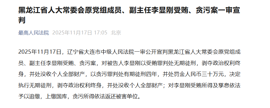 2025年11月17日,辽宁省大连市中级人民法院一审公开宣判黑龙江省人大常委会原党组成员、副主任李显刚受贿、贪污案,对被告人李显刚以受贿罪判处无期徒刑,剥夺政治权利终身,并处没收个人全部财产,以贪污罪判处有期徒刑四年,并处罚金人民币三十万元,决定执行无期徒刑,剥夺政治权利终身,并处没收个人全部财产;对李显刚受贿所得及孳息依法予以追缴,上缴国库,贪污所得依法返还被害单位。