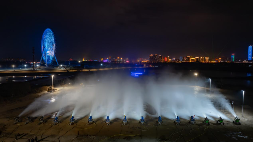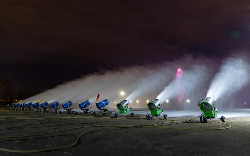 11月17日晚,第二十七届哈尔滨冰雪大世界造雪工作启动,多台造雪机同时开启、测试运转。随着技术人员对设备参数、造雪角度等的调整,皑皑白雪成功从造雪机中不断飘出。