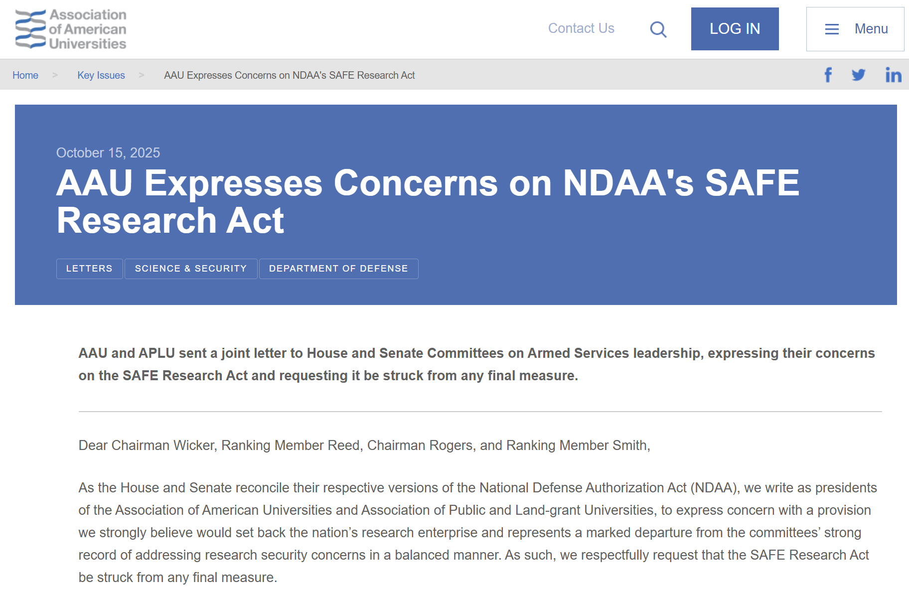 美国大学协会和美国公立与赠地大学协会在致NDAA协调委员会主席的信中指出,这项提案的范围“远远超出保障美国利益所需”。他们写道:“我们理解必须禁止某些合作以确保国家安全,但该法案几乎涵盖了美国大学与海外机构之间的每一份研究协议、每一个海外学习项目、每一门语言课程、每一个专业会议,以及每一处校园设施。”几乎所有形式的国际学术交流无一幸免。