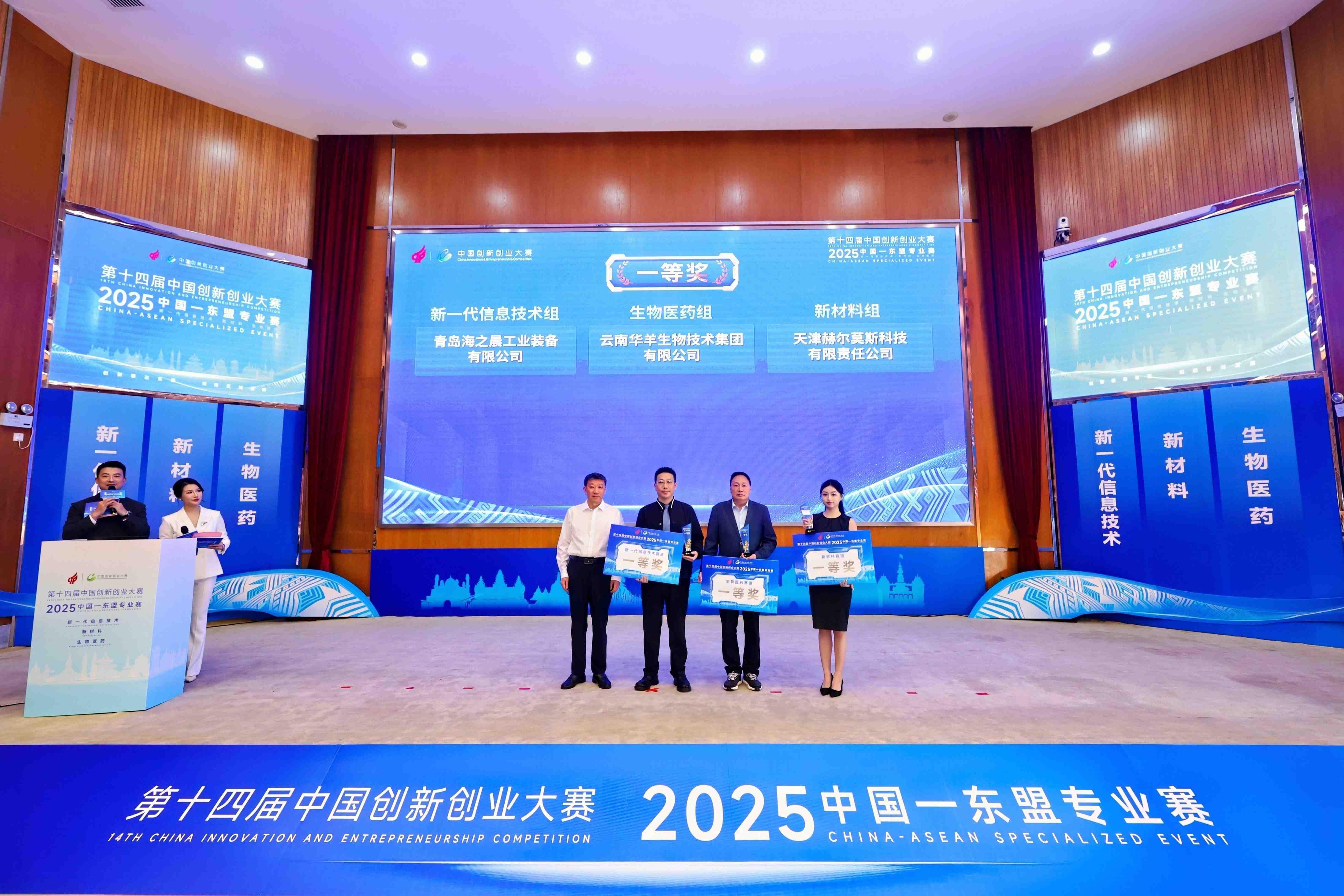 决赛舞台上,新一代信息技术赛道既有服务跨境合作的平台型应用,也不乏突破行业瓶颈的底层技术创新;生物医药赛道既惠及基层,也涌现前沿成果;新材料赛道则聚焦绿色循环与尖端突破。最终,三大赛道一等奖分别由青岛海之晨工业装备有限公司“海之晨·盘古智眸——东盟工业AI视觉产学研赋能平台”项目(新一代信息技术组)、云南华羊生物技术集团有限公司“基于人工智能技术的全流程全自动蜂巢式模块化的细胞制备高端成套装备及细胞药物研发及产业化”项目(生物医药组)、天津赫尔莫斯科技有限责任公司“新型MOFs高效二氧化碳捕集分离膜材料”项目(新材料组)摘得。