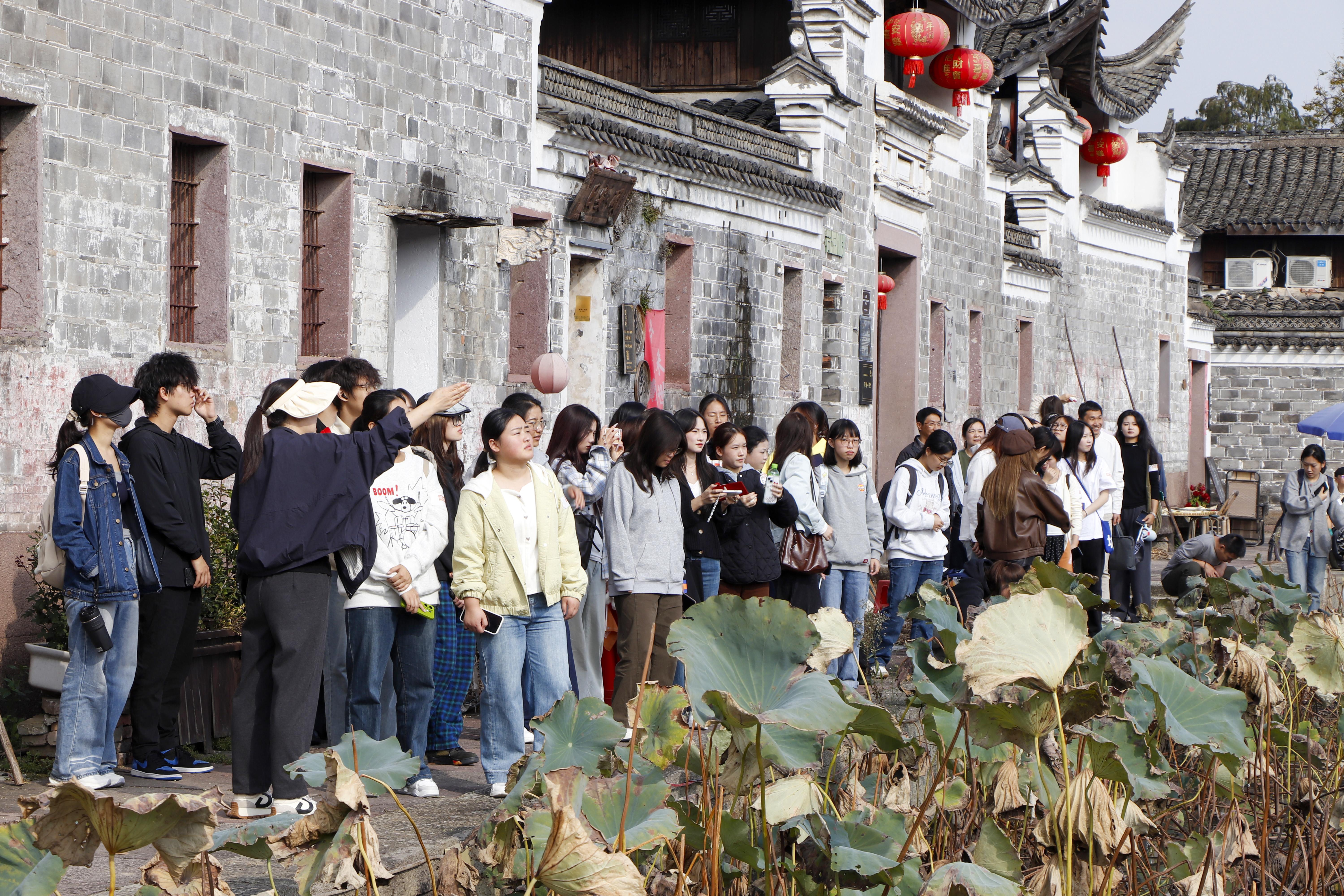 “看,你们脚下这些青石板,曾经有无数赶考的学子走过,这里的一砖一瓦都是活着的历史。”11月15日,浙江省宁波市鄞州区走马塘村的进士广场前,一群穿着卫衣的年轻大学生不时用眼神扫过一个个文化符号,有的低头凝望斑驳的字迹,有的掏出手机拍下石雕花窗……宁波城市职业技术学院“阅城知行”系列活动走进走马塘村,该校党委副书记周树红作为导师正带领大家走读这座古村的文化精神。