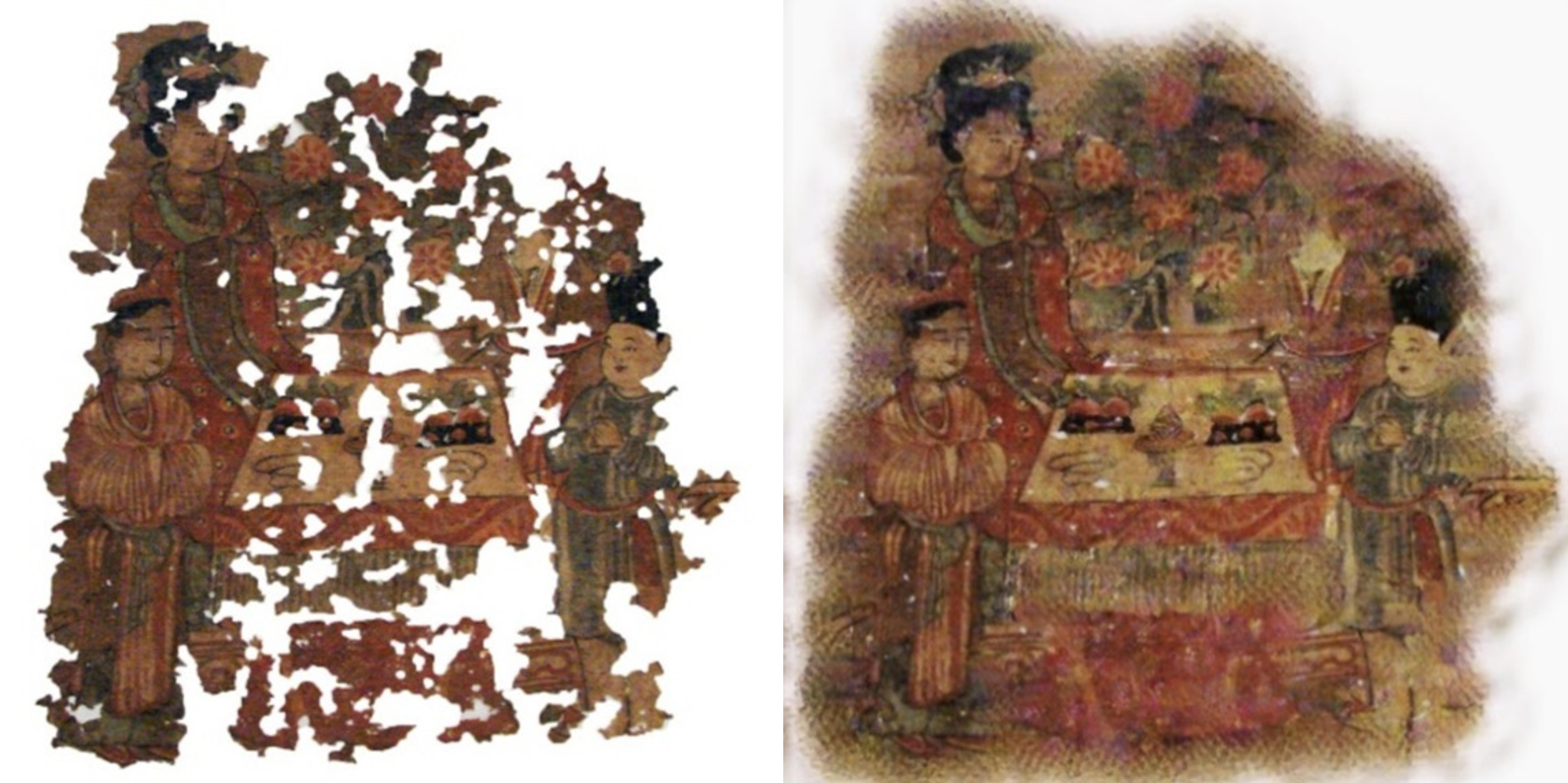 最后,团队运用生成对抗网络(GAN-FCC)技术完成“无痕补全”,对褪色严重的空白区域进行色彩还原,对断裂的纹样进行连贯衔接。