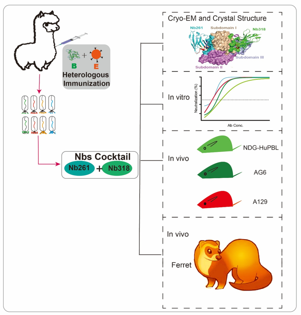 结构生物学研究发现,其中两种纳米抗体Nb261和Nb318分别锁定大别班达病毒蛋白的两处关键位置,能有效阻断病毒感染进程。基于该机制,团队设计出一款由Nb261和Nb318组合的纳米抗体“鸡尾酒”。