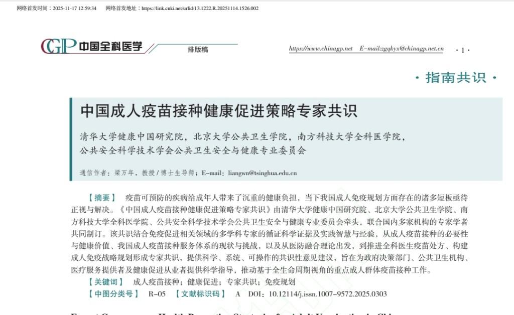 11月17日,我国首个聚焦成人疫苗政策体系,多学科跨领域的专家共识《中国成人疫苗接种健康促进策略专家共识》(以下简称《共识》)发布。《共识》由清华大学健康中国研究院、北京大学公共卫生学院、南方科技大学全科医学院、公共安全科学技术学会公共卫生安全与健康专业委员会牵头,联合近50位专家学者共同完成。