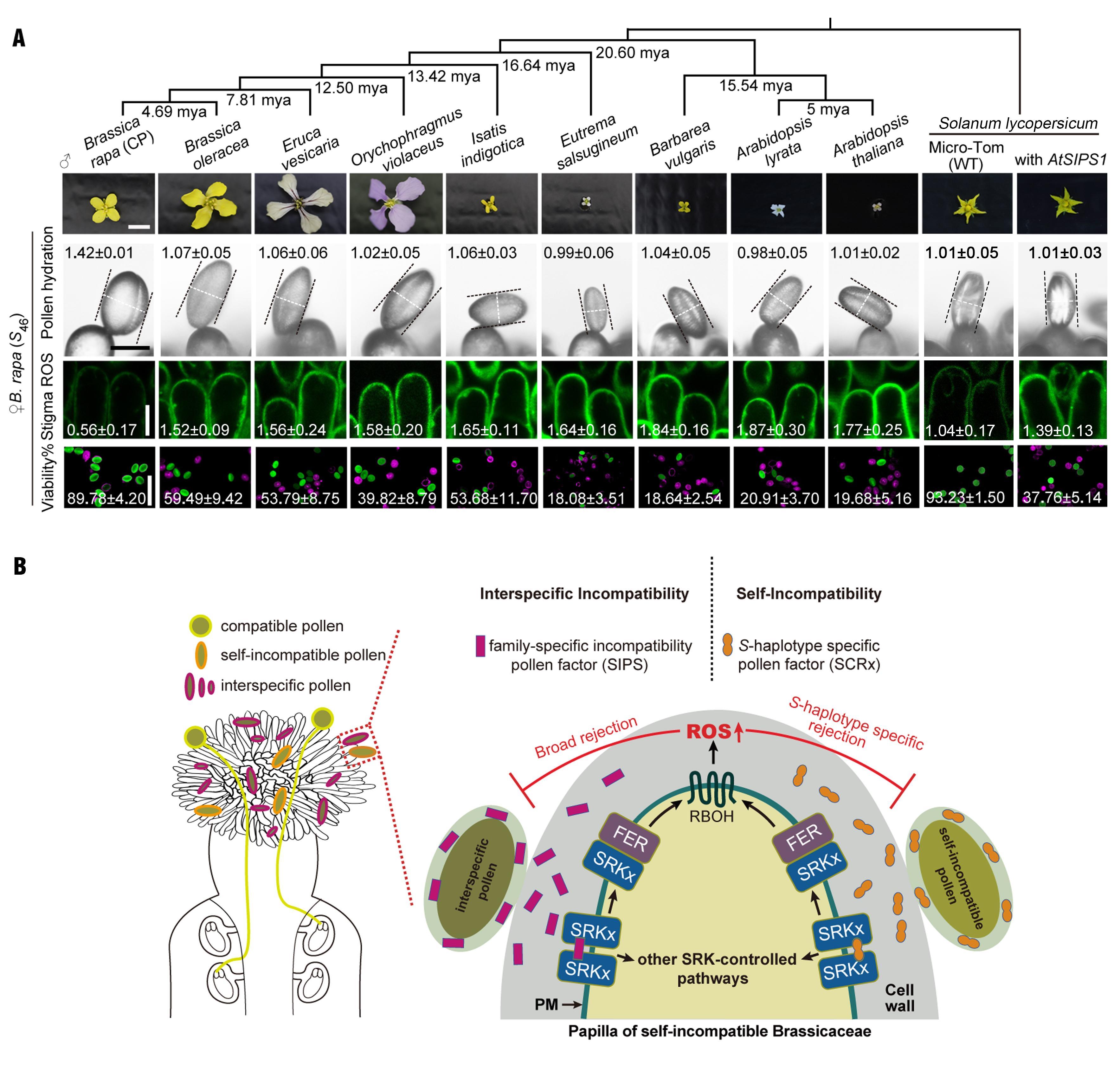 该团队通过酵母双杂交和免疫共沉淀技术,从花粉蛋白中“钓”出这个关键小分子蛋白SIPS。实验显示,若将SIPS基因敲除,原本被拒的远缘花粉竟能“蒙混过关”,成功完成受精。SIPS在十字花科植物中普遍存在,具有“通用性”,而在番茄等非十字花科植物中则不存在。若将SIPS导入番茄花粉,它也能“拉响警报”,被白菜柱头识别并拒之门外。