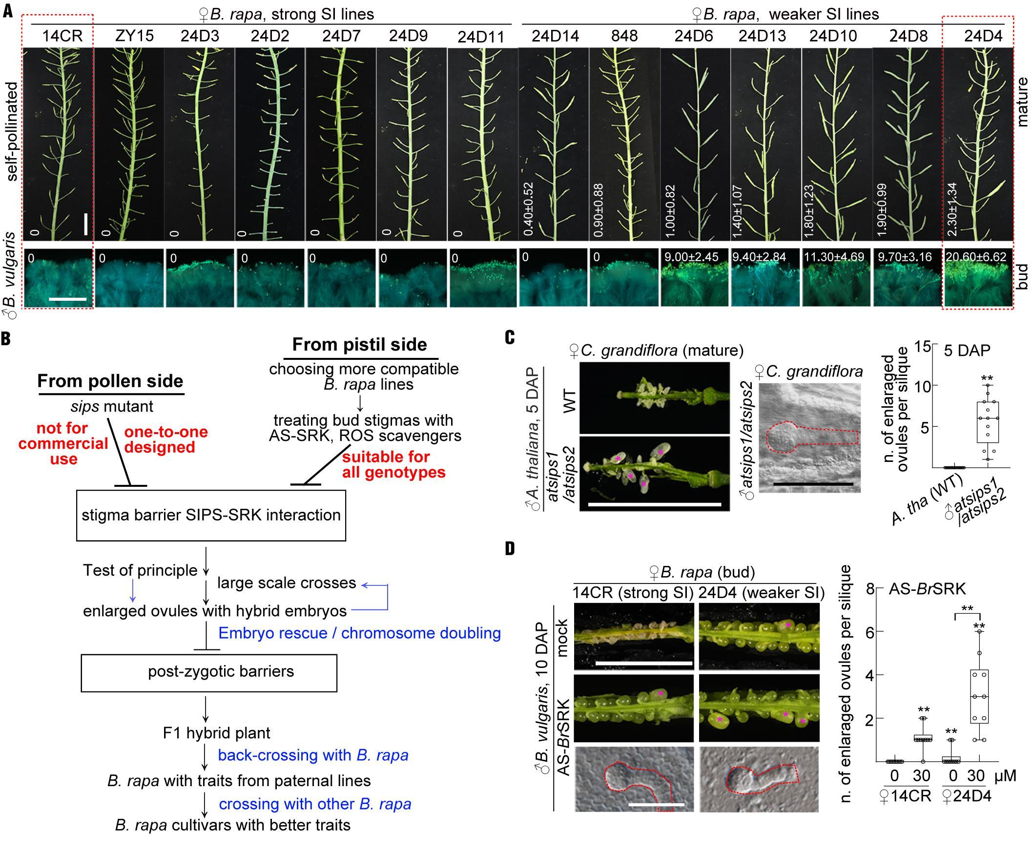 过去,远缘杂交成功率极低,育种家常需耗费大量人力物力进行测交筛选。段巧红团队基于这一机制,开发出一套“组合拳”技术:选用自交不亲和性弱的母本,配合反义寡核苷酸抑制SRK表达或使用活性氧清除剂,有效降低柱头“戒心”,让远缘花粉顺利“通关”。