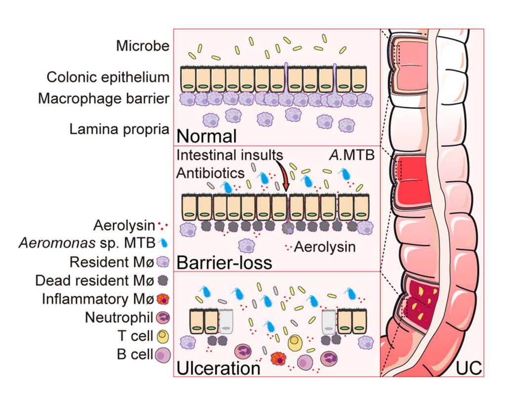 是什么原因诱发了“起始事件”?研究团队从溃疡性结肠炎粪菌中分离获得了产生溃疡性结肠气溶素的病原菌,全基因组测序和生理生化实验显示,这些菌株属于气单胞菌属的一个新亚种,因它具有破坏巨噬细胞的特性,研究者将其命名为巨噬细胞毒性气单胞菌Aeromonas sp MTB。