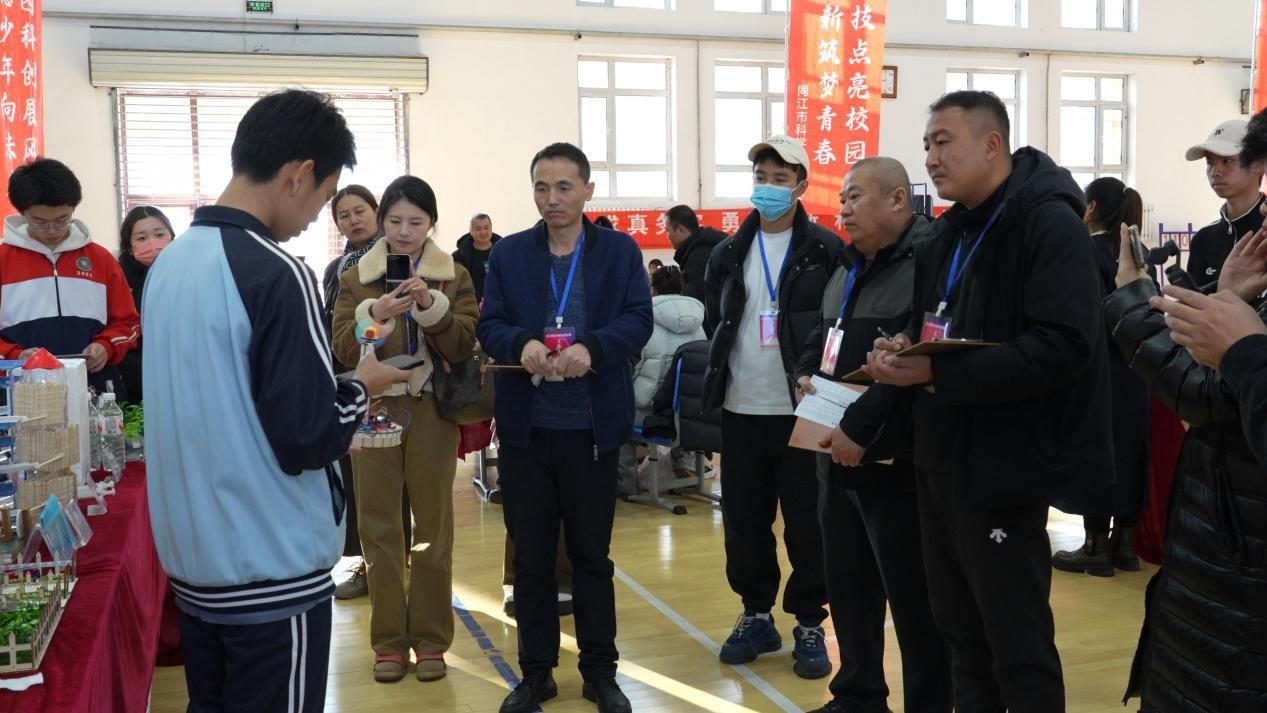 同江市第一小学体育馆内比赛气氛热烈,桌面上各种设计产品精细还原了三江口生态旅游区同三公路标志塔、同江中俄铁路大桥等同江元素,展现了学子们对家乡建设的深切关注;充满创意的“神舟二十一号”航天模型与空间站装置,则承载着他们探索宇宙的远大梦想。参赛学生化身为“小小发明家”,结合模型,向评委自信讲解创作理念。评委团聆听后,从多种维度进行现场打分,确保了赛事全程公平、公正与高效。