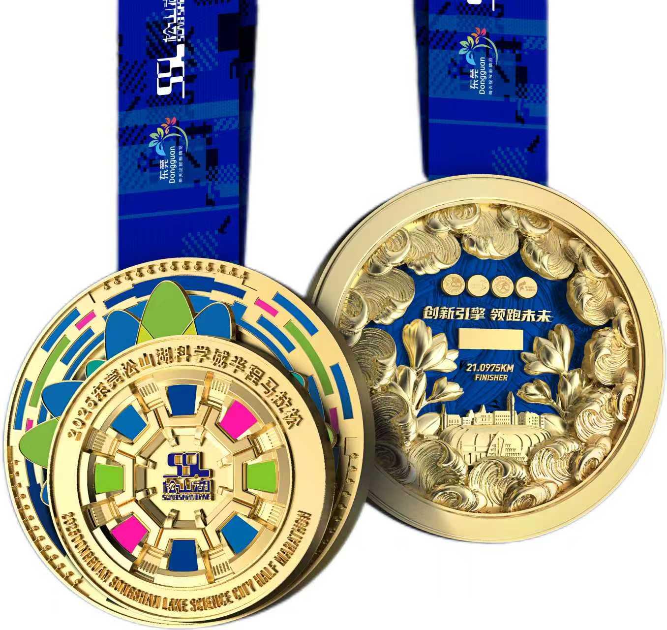 完赛奖牌正面通过双层环结构诠释科技内核:彩色大环以灵动缤纷科技线条,将松山湖蓬勃的创新生态与发展活力具象化。双环间可旋转的中国散裂中子源部件元素致敬这一“国之重器”,也象征科学探索与运动精神的动态共生。